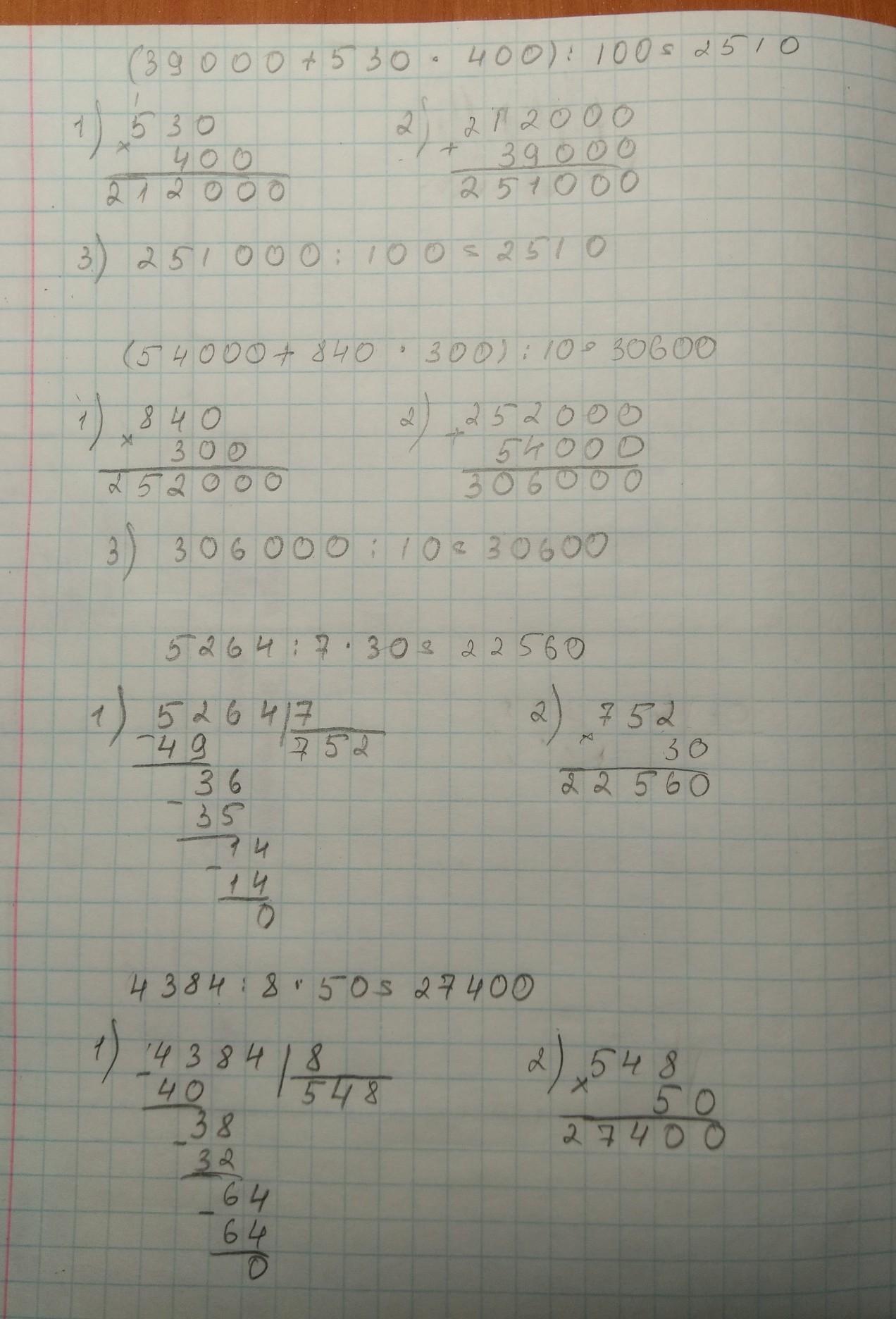 Помогите решить примеры и расписать по действиям. (39000+530×400)÷100=?,(54000+840×300)÷10=?,5264÷7×30=?,4384÷8×50=?