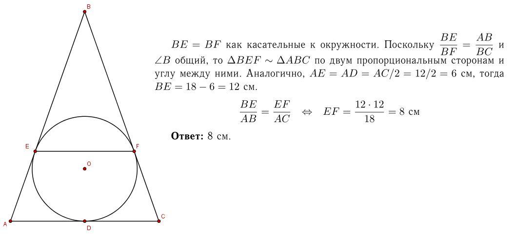 У рівнобедрений трикутник, основа якого дорівнює 12 см, а бічна сторона – 18 см, вписано коло. Знайдіть відстань між точками дотику цього кола до бічних сторін трикутника.