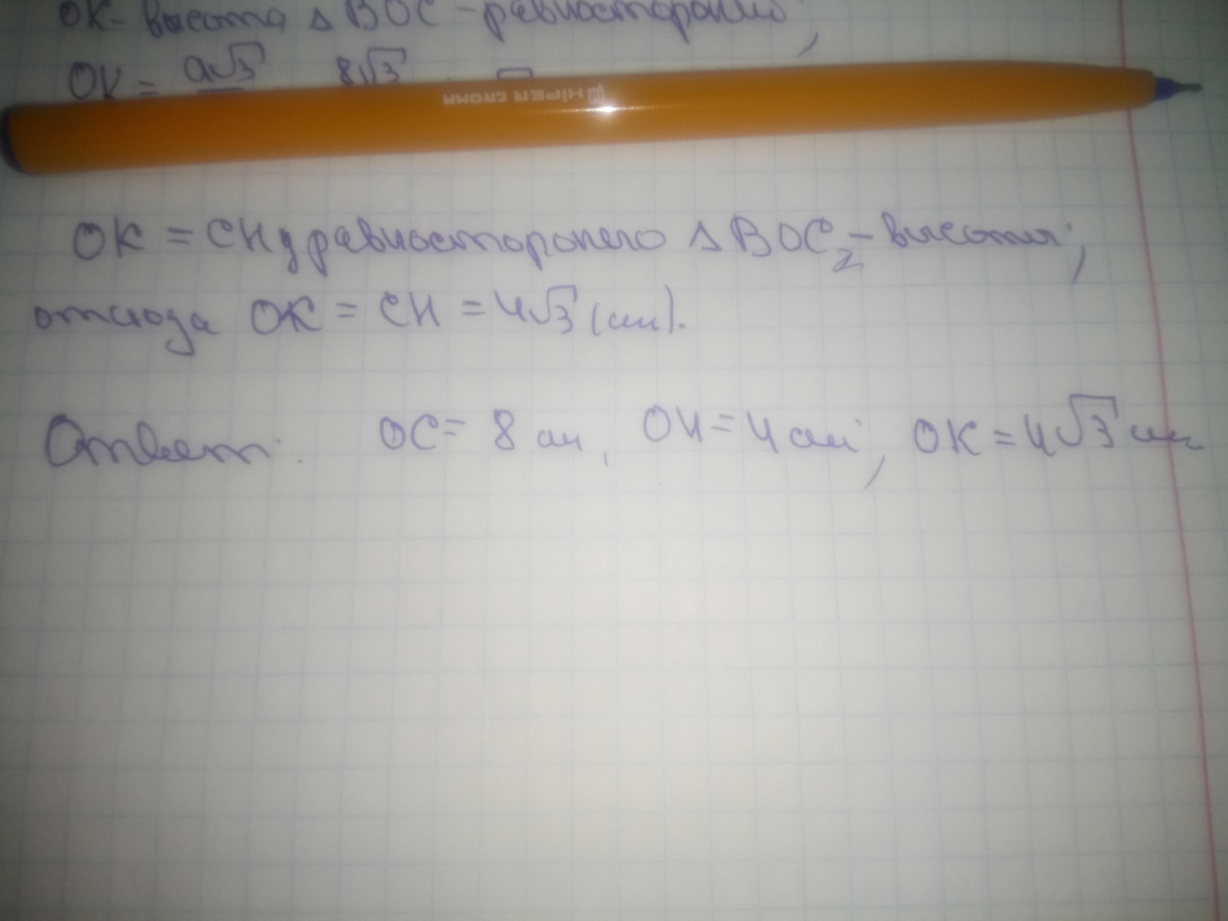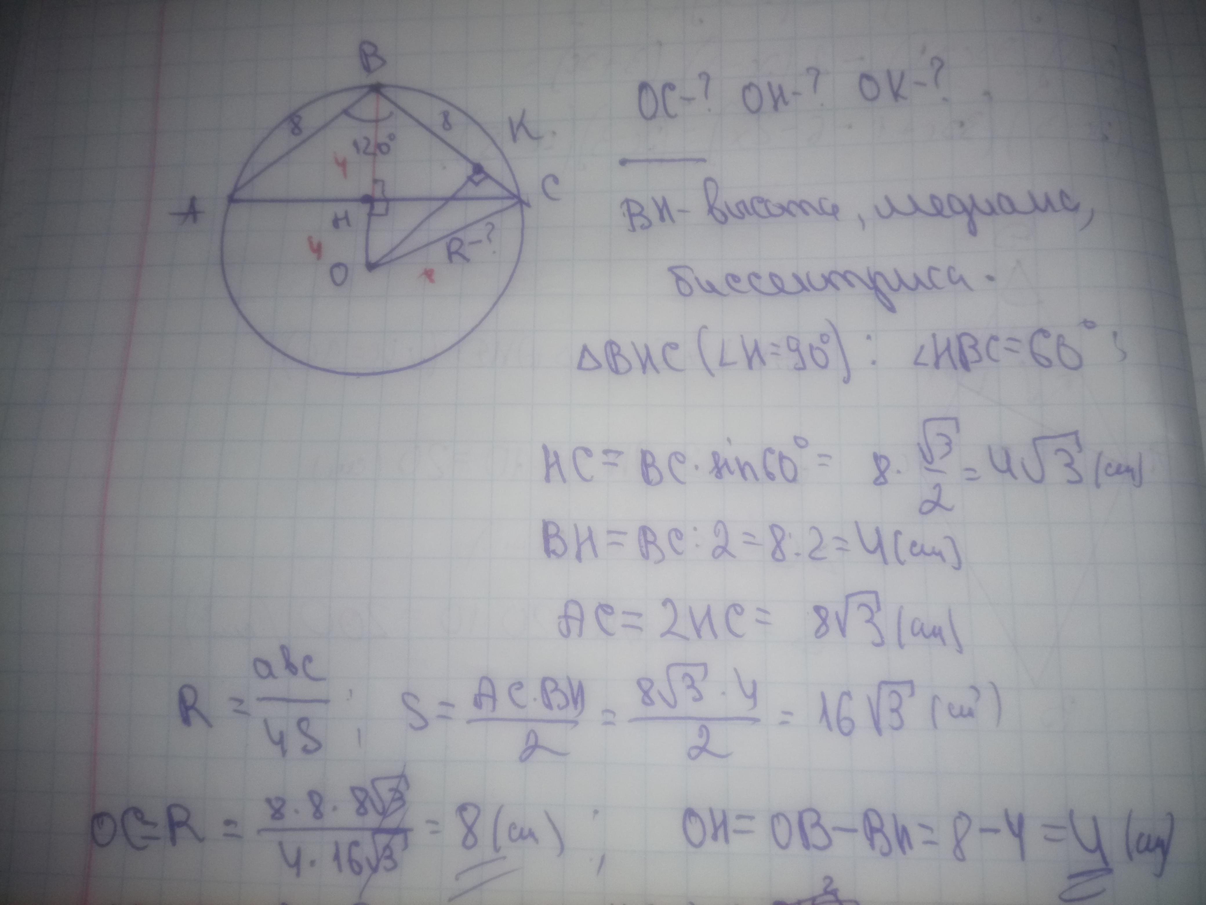 Равнобедренный треугольник с углом 120 ° и ребром 8 см имеет круговую окружность. Рассчитайте радиус круга и расстояние от центра круга до сторон!