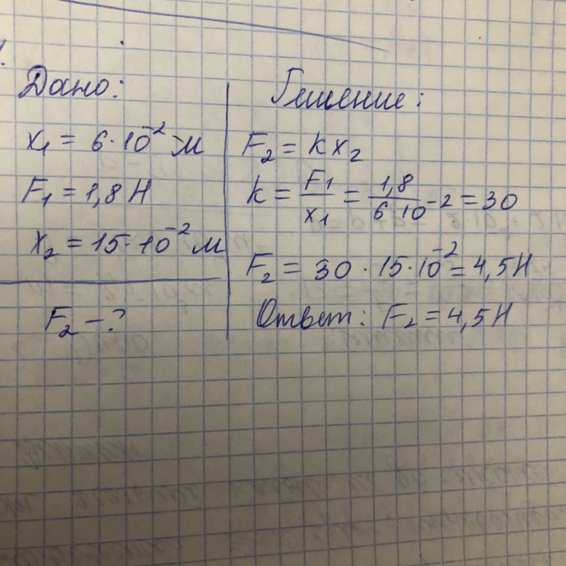 При растяжении пружины на 6 см возникает сила упругости 1,8H. Какая сила возникает при растяжении этой пружины на 15