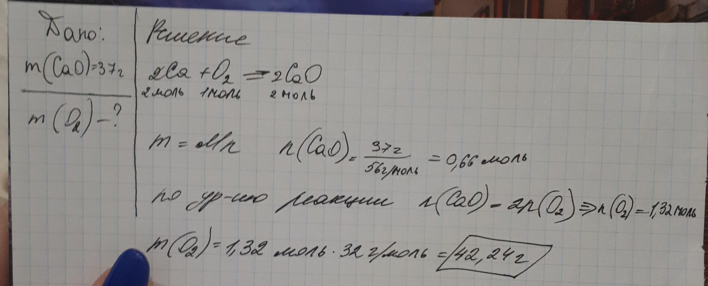 По уравнению реакции 2Ca+O2=2CaO рассчитайте массу кислорода вступившего в реакцию если масса образовавшегося оксида кальция равна 37 г
