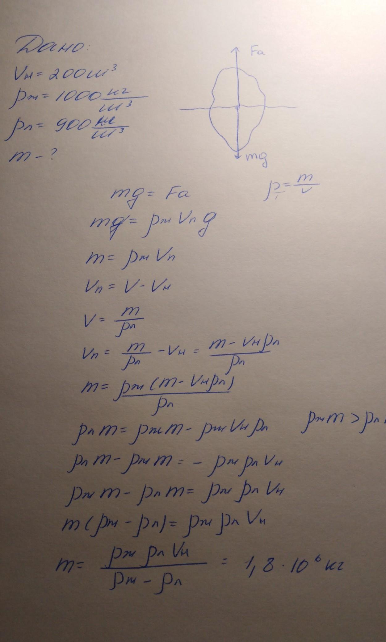 определите массу в килограммах айсберга с объёмом надводной части в 200 м³ плотность воды равна 1000 кг/метр³ плотность льда 900 кг/метр³