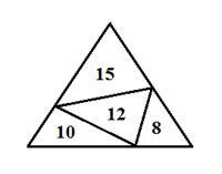 Треугольник, у которого все стороны равны, разбили тремя отрезками на 4 части так, как показано на рисунке. Известно, что периметры этих частей равны: 15, 12, 10 и 8. Найдите длину стороны треугольника.