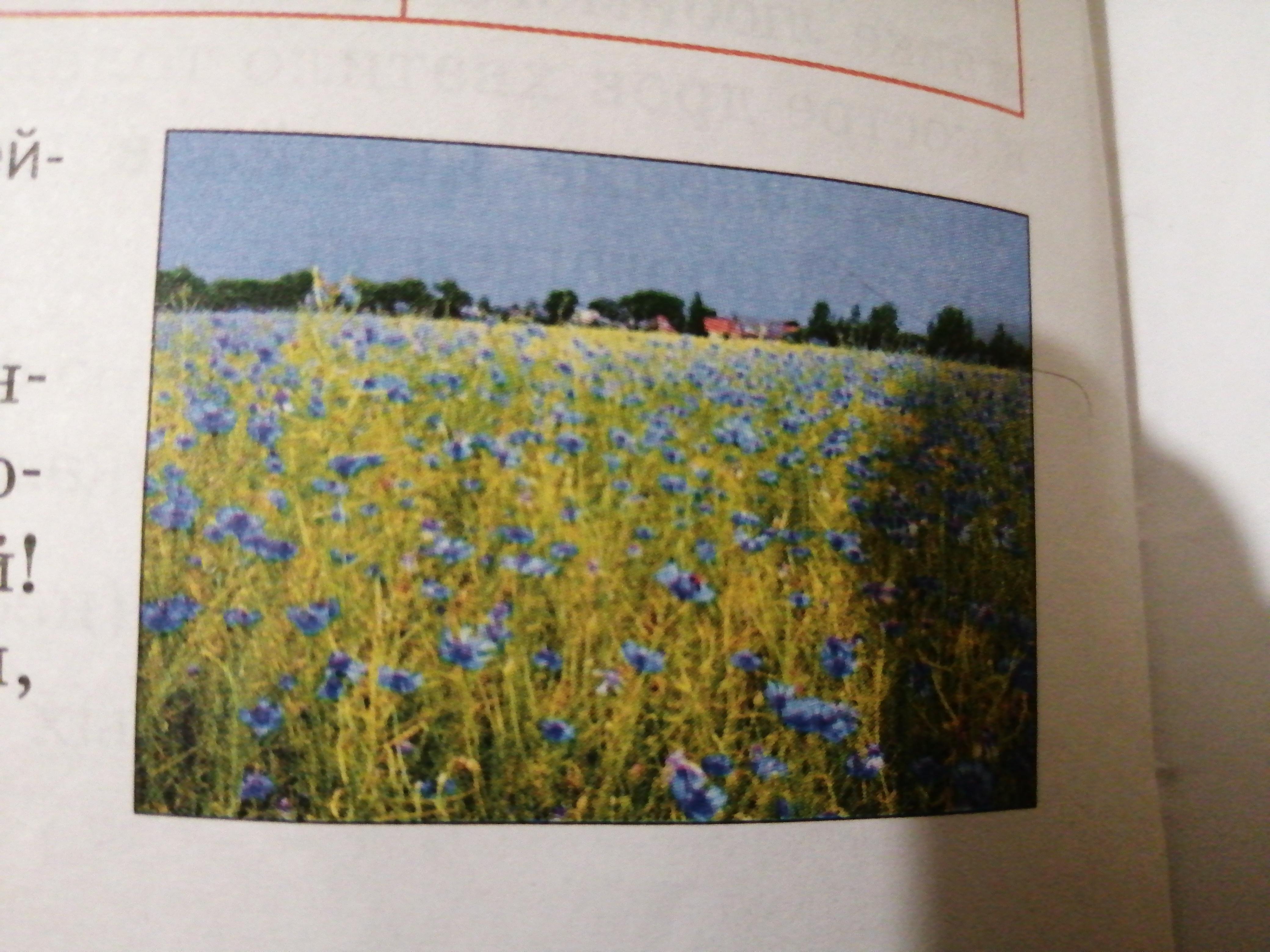 Я перед собой вижу замечательную картину. На ней я вижу замечательное поле с синими цветами,и с деревьями на заднем плане виднеются различные зелёные деревья и красный дом, а за домом можно увидеть голубые небеса.