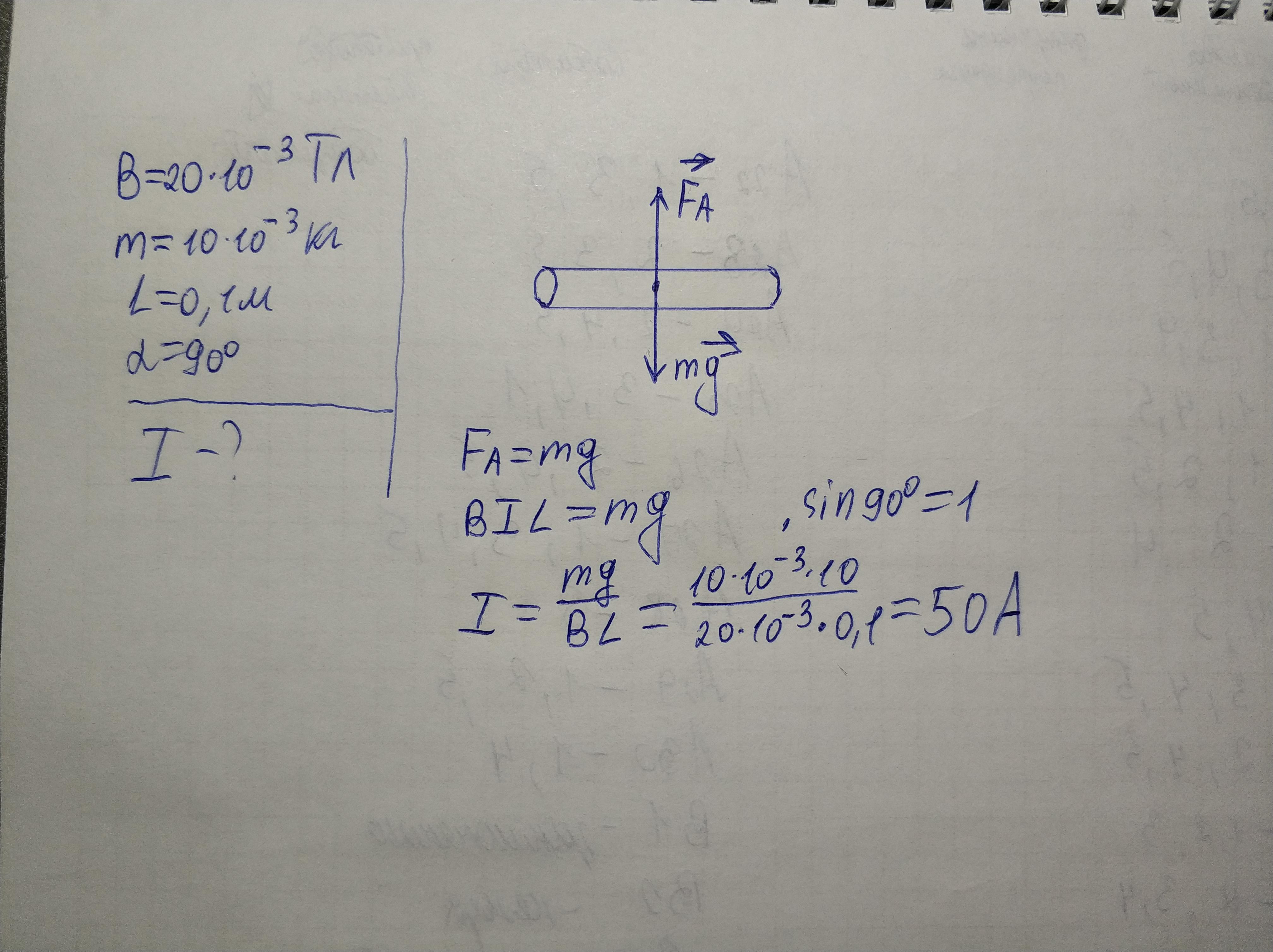 Под действием магнитного поля с индукцией 20 мТл, проводник массой 10 г находится в равновесии. Длина проводника 10 см. Магнитные линии и ток образуют угол 90°. Найти силу тока.