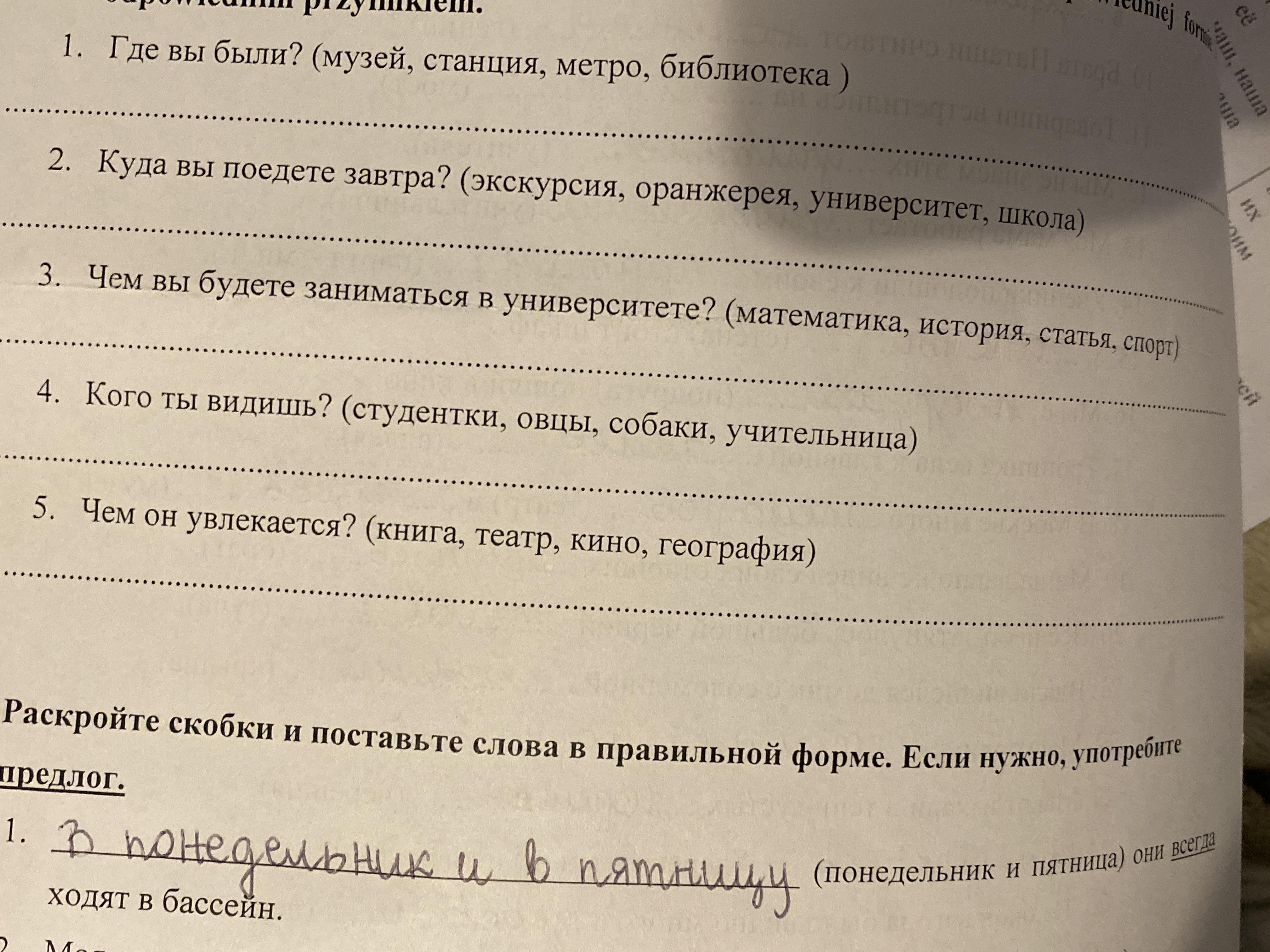 2) на экскурсию;в оранжерею;в университет;в школу.