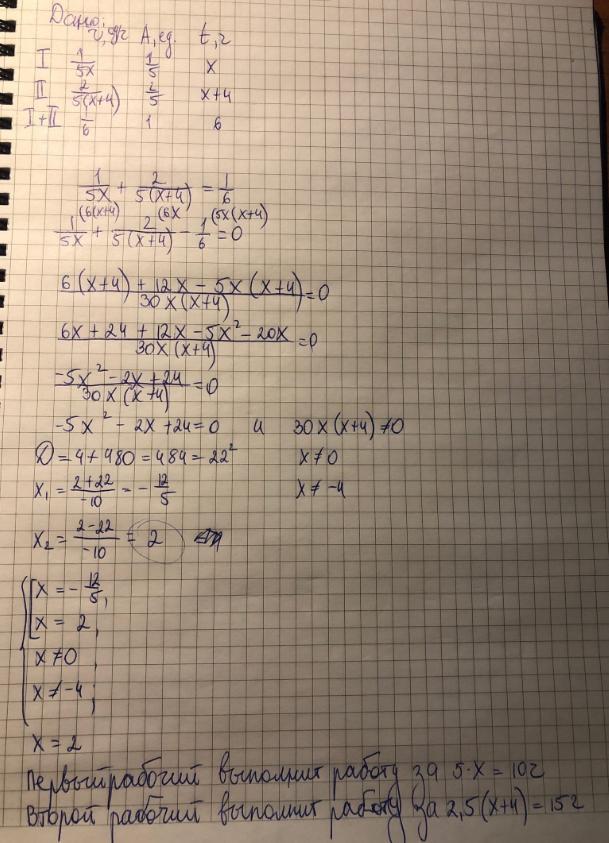 Рисуем таблицу, из которой - первый рабочий выполняет 1/5 работы за х часов, второй - 2/5 работы за x+4 часов. Следовательно, за час они будут выполнять и