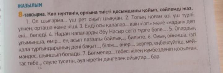 1.Ол шығарманы үш рет оқып шыққан. 2.Толық қоғам өзі үш түрлі: үлкен, орташа және кіші. 3. Енді осы қалалардың өзін "ізгі" және "надан" деп екіге бөледі. 4. Надан қалаларды Әбу Насыр сегіз түрге бөледі. 5. Олардың ұғымынша, өмірдің ең асыл ләззаты байлықпен билікте. 6. Оның ойынша, ізгі қала тұрғындарының дені бақытты, білімді, өнерлі, зергер, еңбексүйгіш, меймандос, шыншыл болады. 7. Бөлмелердің төбесі кілең күмбездеңіп қосылған, тас төбесі сәуле түсетін, ауа кіретің дөңгелек ойықтары бар.