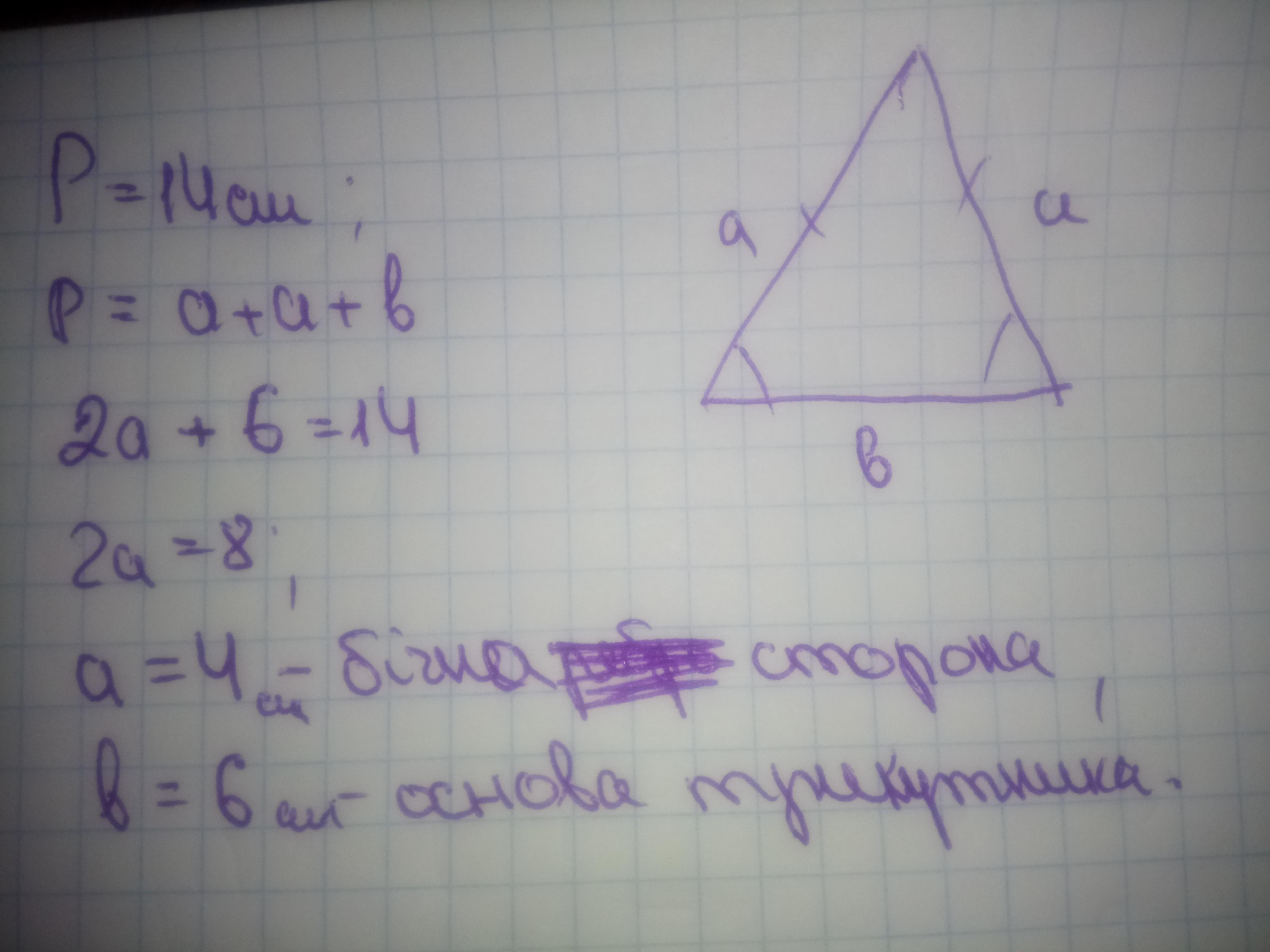 Знайдіть сторону рівнобедреного трикутника, якщо периметр - 14 см і він більше за суму двох бічних сторін на 6 см