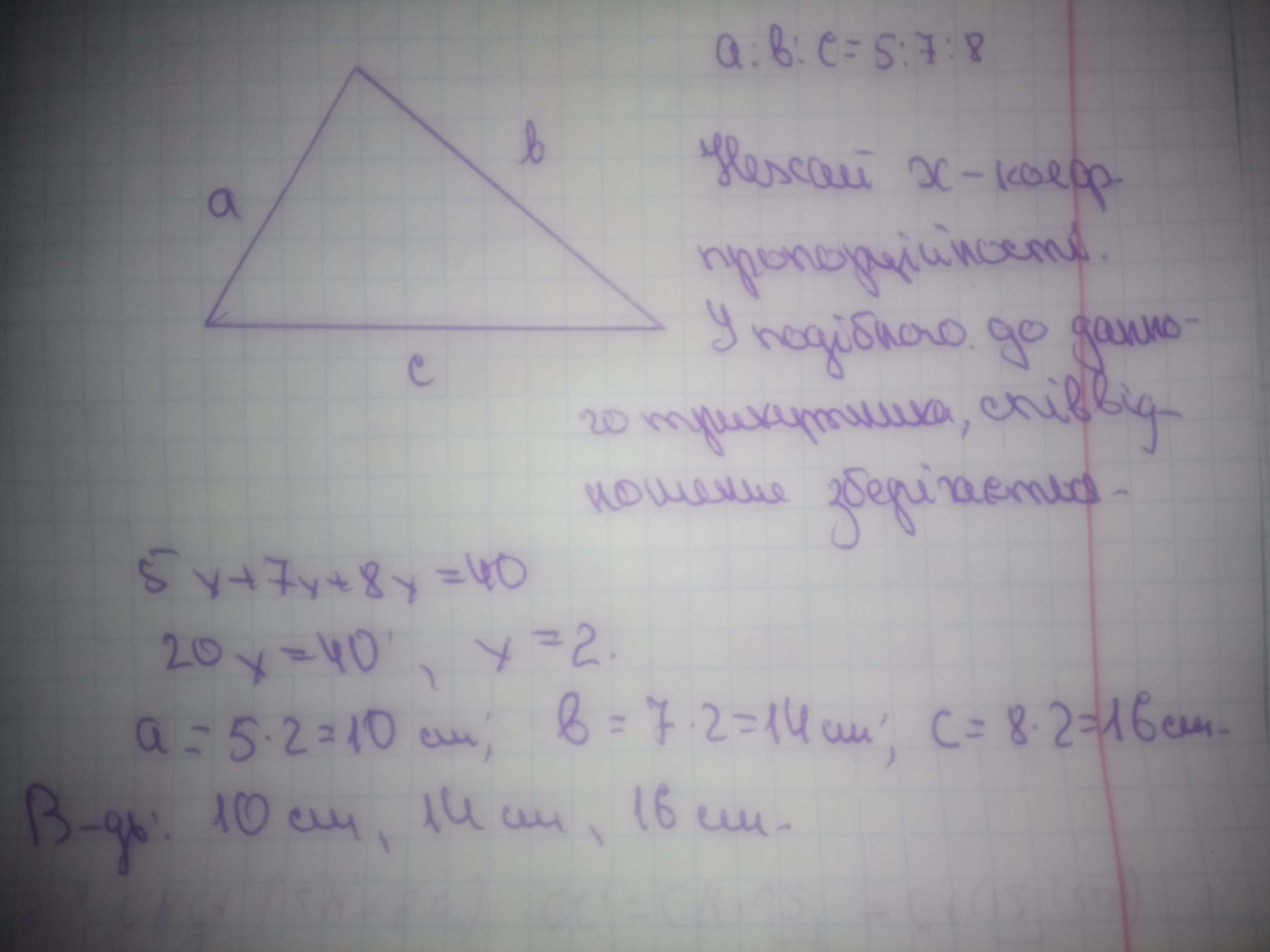 Сторони трикутника відносяться як 5:7:8 Знайдіть невідомі сторони подібного до нього трикутника якщо його периметр дорівнює 40 см