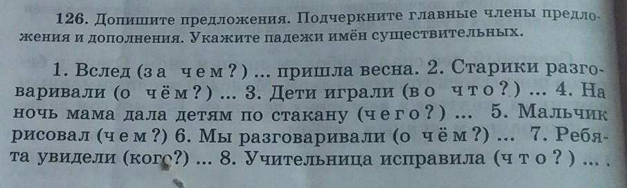 126. допишите предложения. подчеркните главные члены предложения и дополнения. укажите падежи имён. Срочно