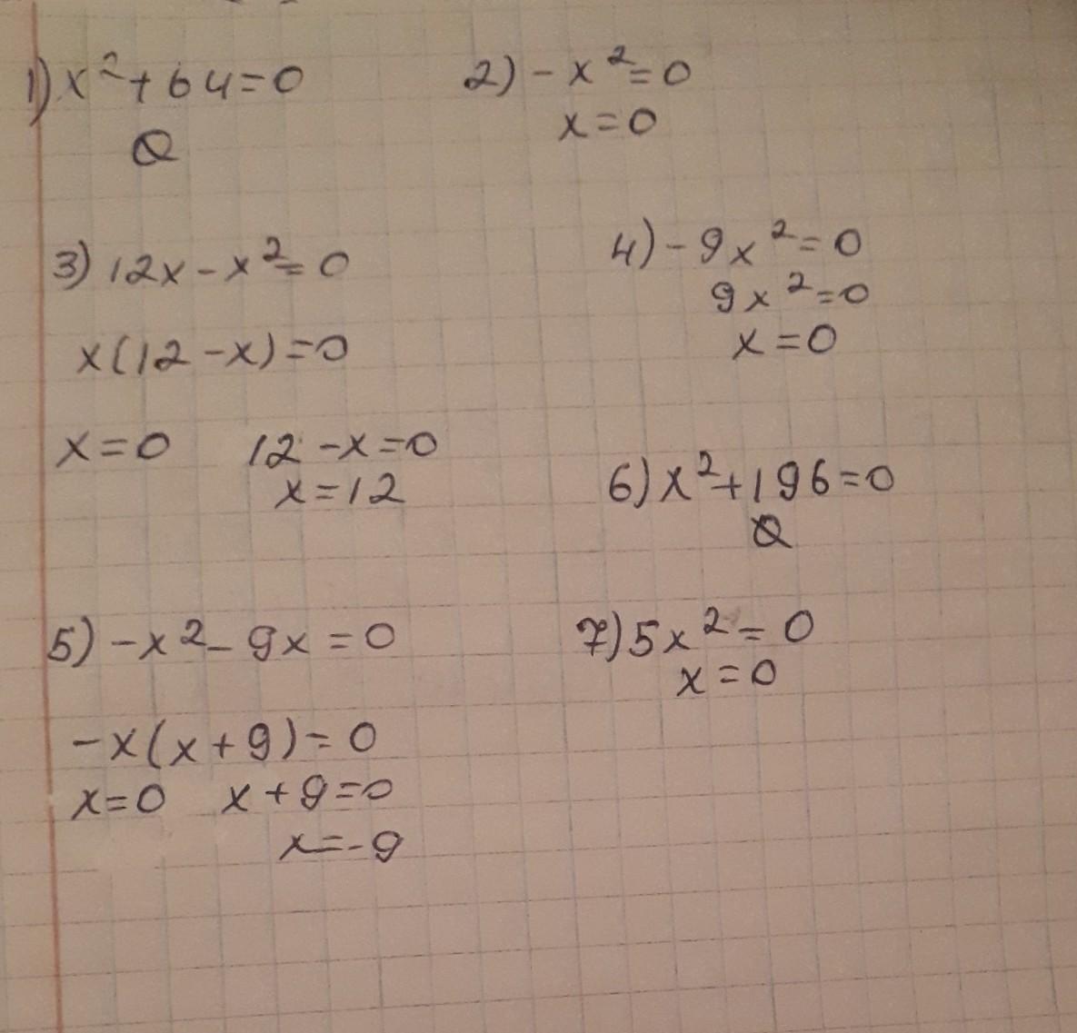 решите уравнения x^2+64=0, -x^2=0, 12x-x^2=0, -9x^2=0, -x^2-9x=0, x^2+196=0, 5x^2=0, x^2+9x=0, x^2+4=0, -6x^2=0 СРОЧНО!!!