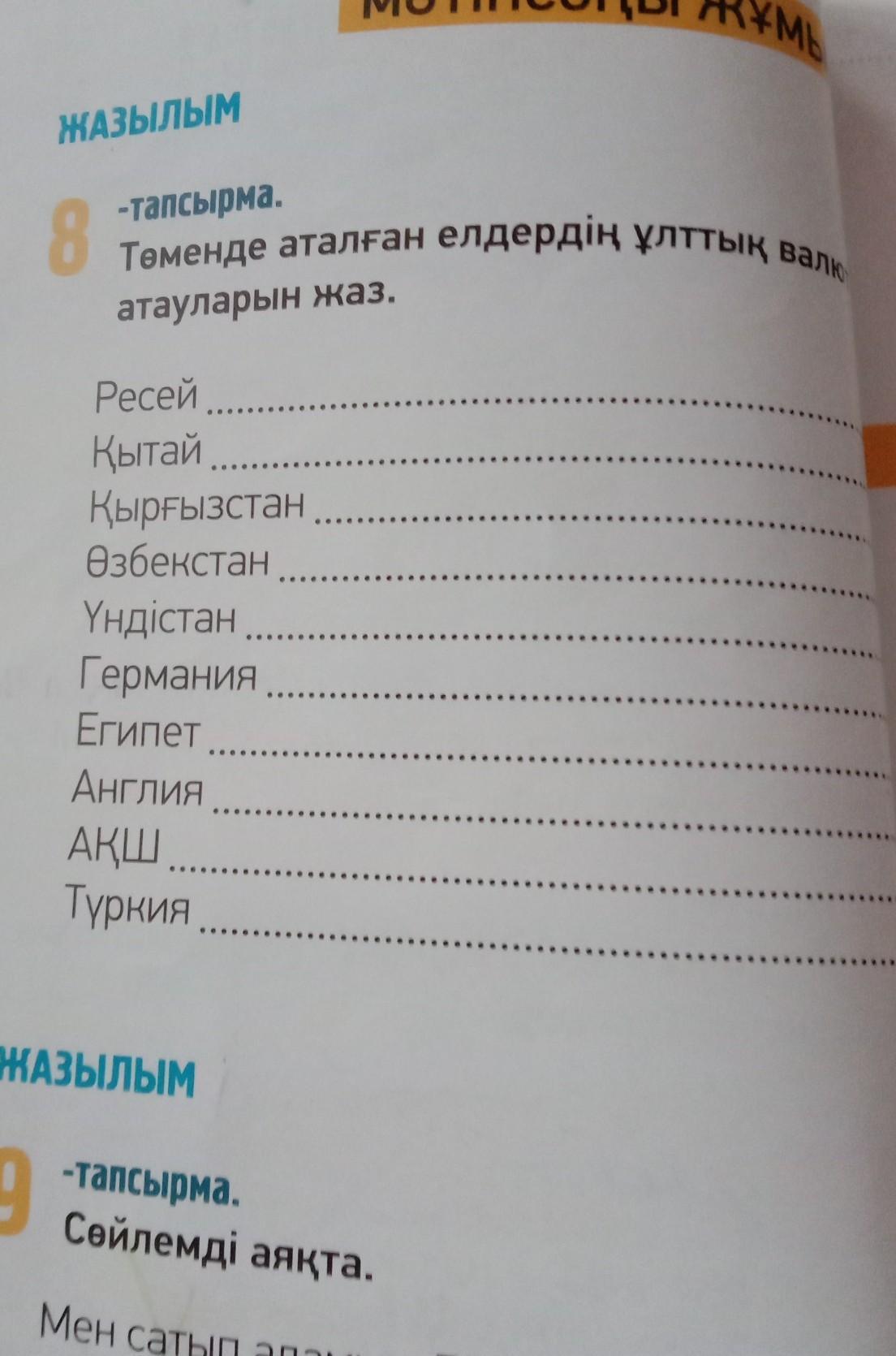 помогите пожалуйста с казахским! (надо написать в какой стране какую валюту используют)