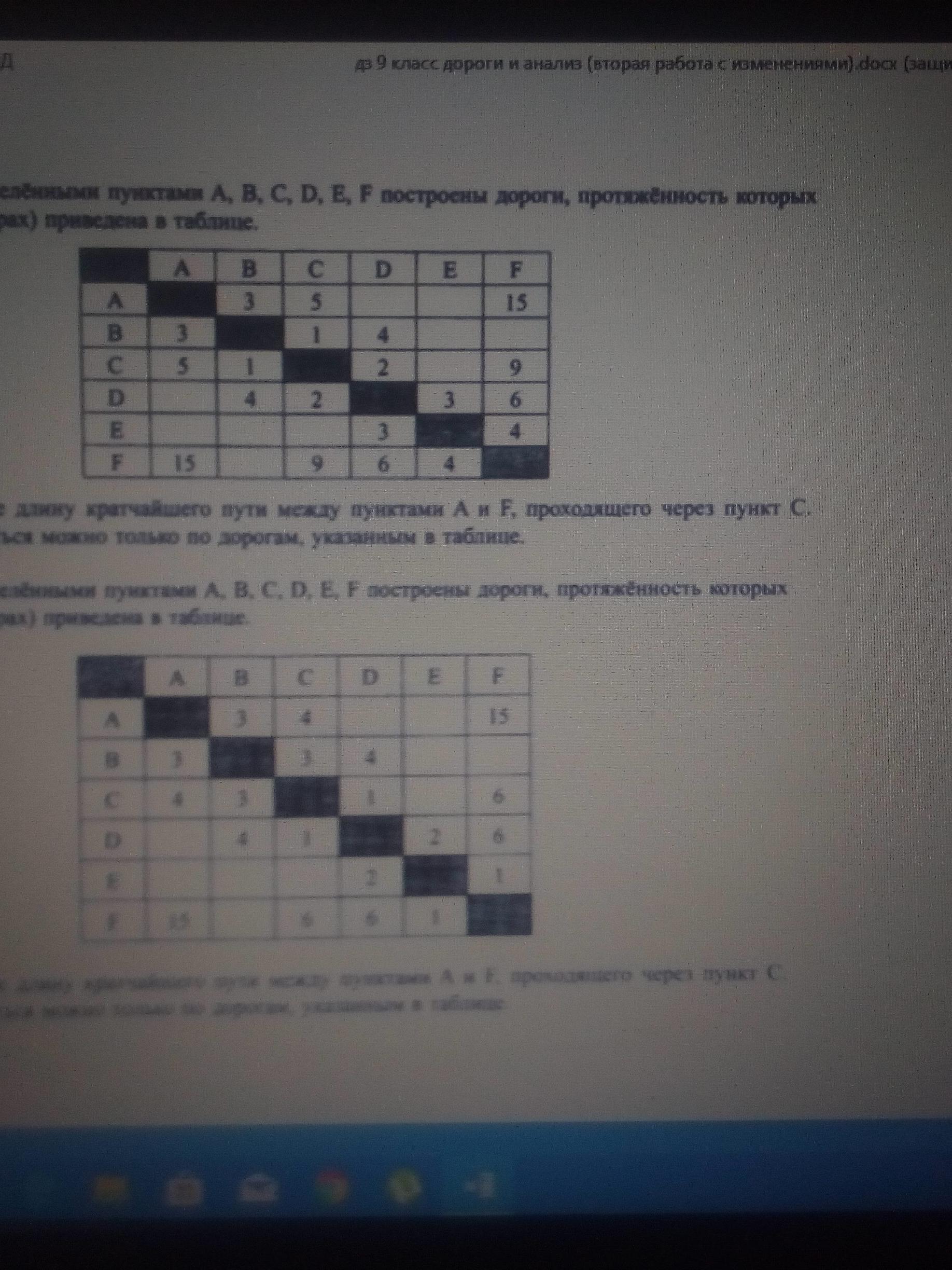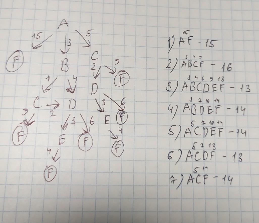 Помогите пж. Работа с графами и дорогами. Между населенными пунктами A,B,C,D,E,F построены дороги протяженность приведена в таблице. Определить длину кратчайшего пути между пунктами A и F