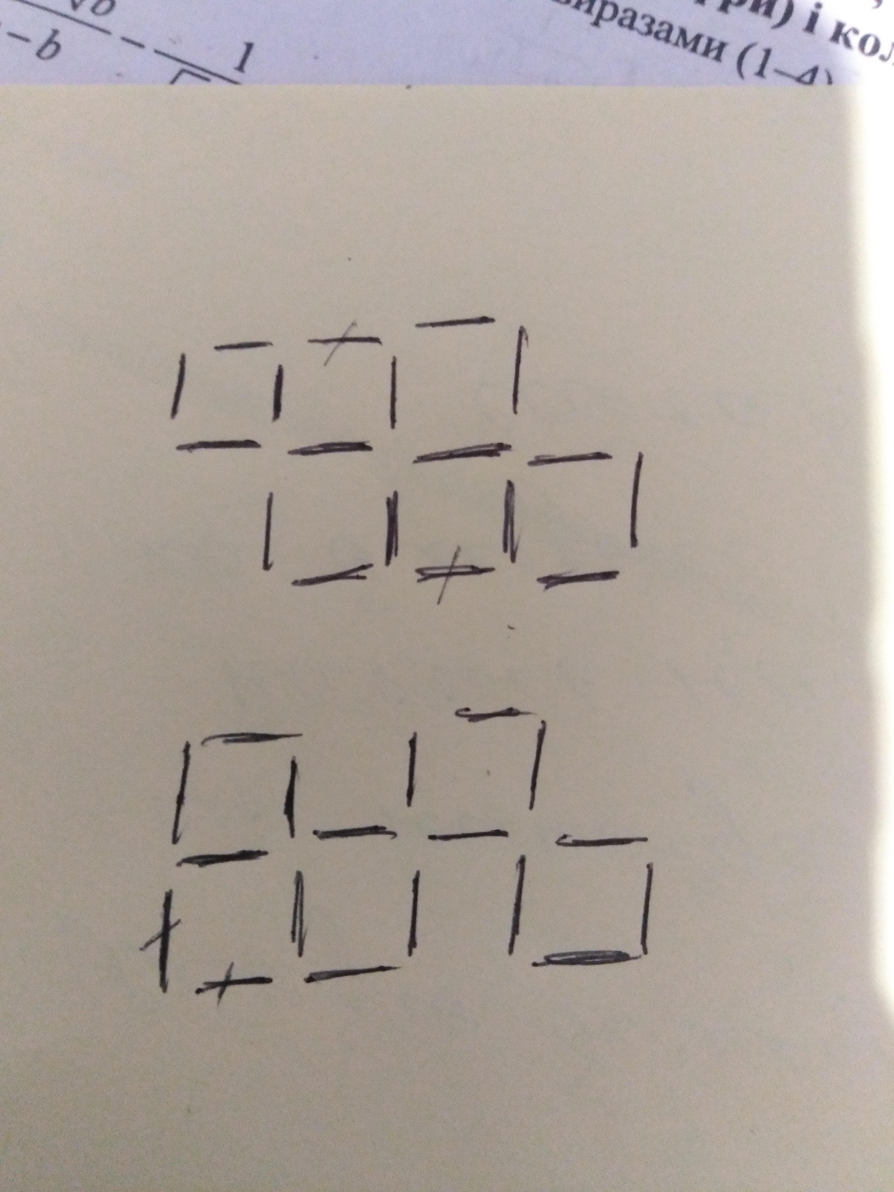 Составь из палочек такую фигуру. Объясни, как можно переложить 2 палочки так, чтобы получилось 5 квадратов