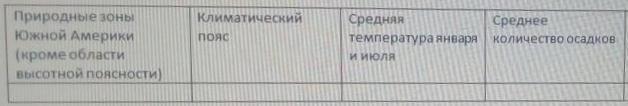 Природные зоны Южной.Америки:Тропические и Экваториальные пояса; Климатический пояс:Экваториальный,Субэкваториальный,Умеренный,Субтропический,Тропический. Средняя Температура января и июля:Январь:+15 в среднем;Июль:+25 в среднем; Среднее количество осадков:3000,1500,500,250,250