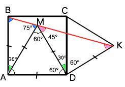 На стороне квадрата ABCD построены равносторонние треугольники - ADM (внутри квадрата) и CDK(вне квадрата). Докажите, что точки B M и K лежат на одной прямой.