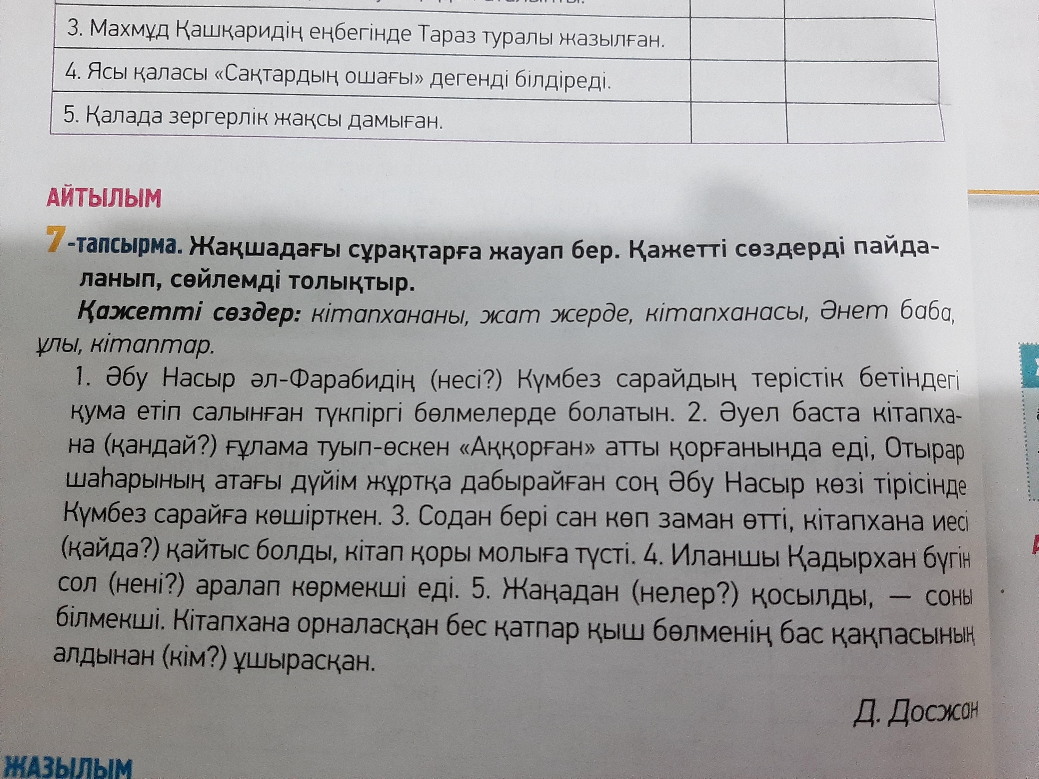1) кітапханасы. 2) ұлы. 3) Жат жерде. 4) кітапхананы. 5) кітаптар. 6) Әнет Баба