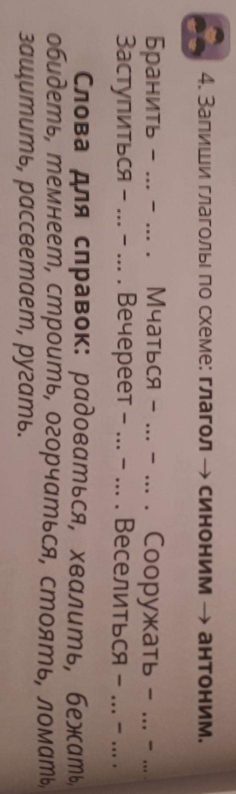 Бранить - обидеть - хвалить. Мчаться - бежать - стоять. Сооружать - строить - ломать. Заступаться - защитить - ругать. Вечереет - темнеет-рассветает. Веселиться - радоваться - ругать.