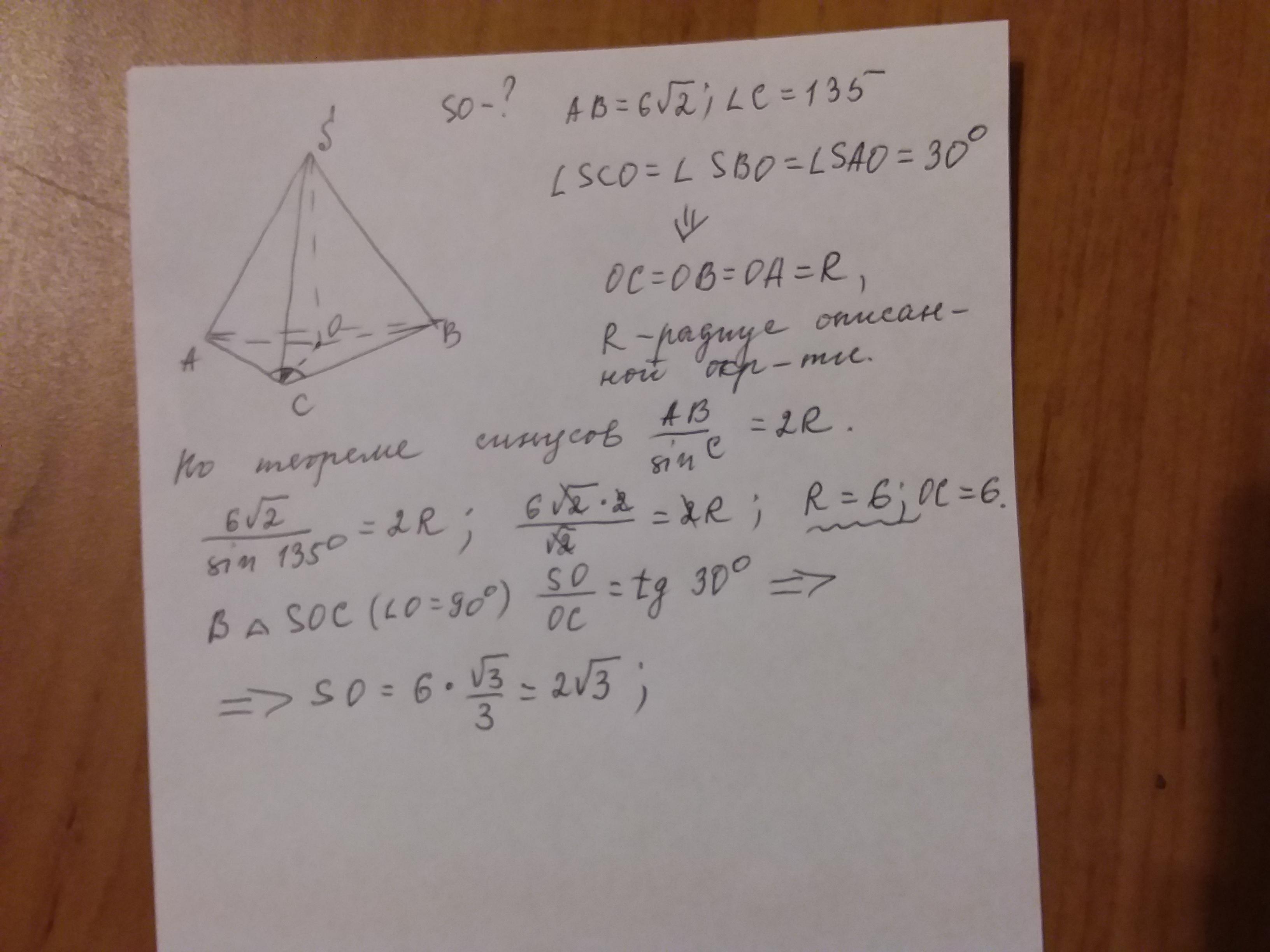 В основании пирамиды SABC лежит треугольник АВС, АВ = 6√2 см, угол С=135 °. Боковые ребра образуют с плоскостью основания равные углы в 30°. Найти высоту пирамиды. Даю 30 баллов!!!!