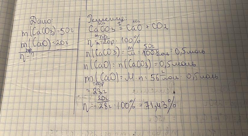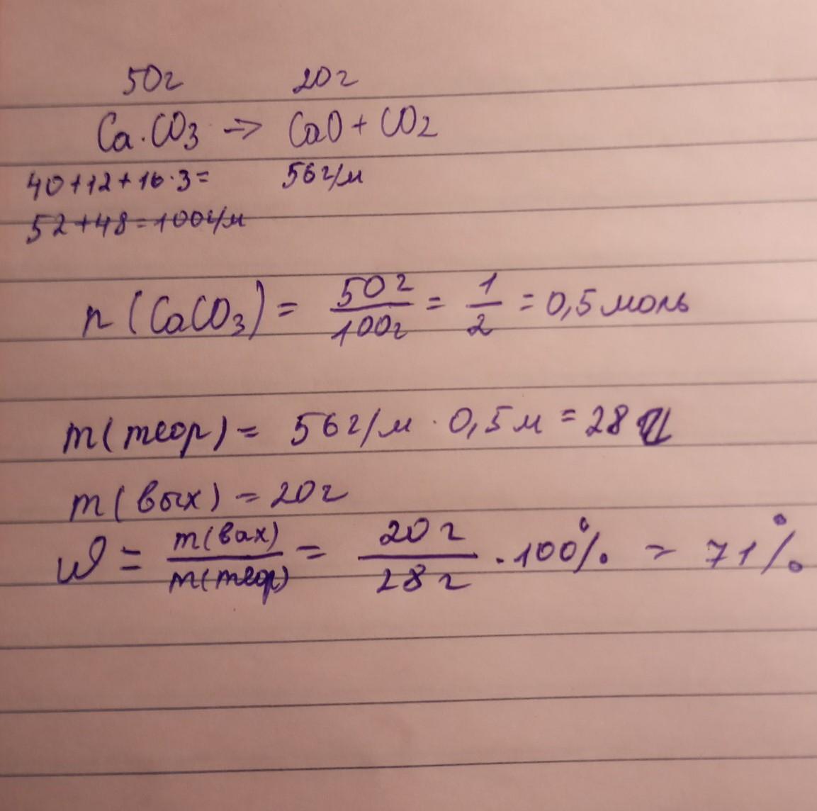 при прокаливании 50 г кальция карбоната получено 20 г негашеной извести. Вычислите выход продукта от теоретически возможного