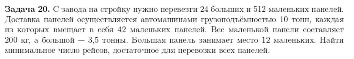 С завода на стройку нужно перевезти 24 больших и 512 маленьких панелей. Доставка панелей осуществляется автомашинами грузоподъёмностью 10 тонн, каждая из которых вмещает в себя 42 маленьких панелей. Вес маленькой панели составляет 200 кг, а большой - 3,5 тонны. Большая панель занимает место 12 маленьких. Найти минимальное число рейсов, достаточное для перевозки всех панелей.