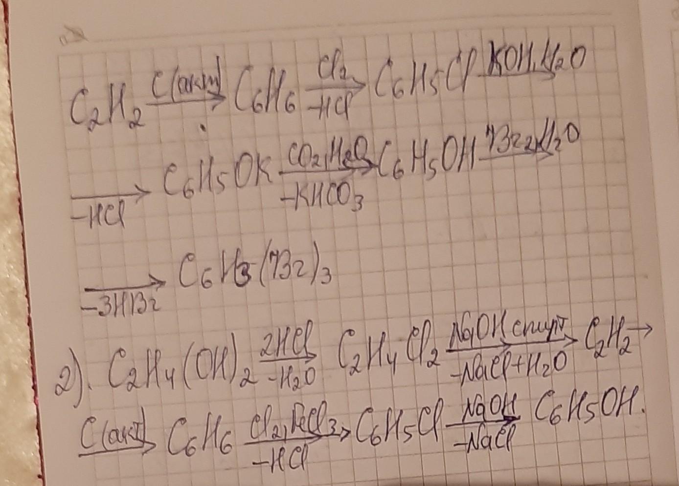 C2H2 (C акт.) → X1 (Cl2,Fe) → X2 (KOH,H2O) → X3 (C02,H2O) → X4 (Br2,H2O) → X5