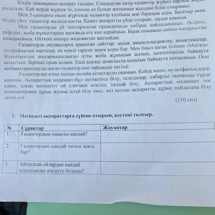 ПОМОГИТЕ ОТВЕТИТЬ НА ВОПРОСЫ ПО ТЕКСТУ СРОЧНО ПОЛНЫЕ ОТВЕТЫ !!!!! НА КАЗАХСКОМ ЯЗЫКЕ НА 3 ВОПРОСА ОТВЕТЬТЕ