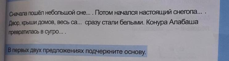 Сначала пошёл(сказуемое) небольшой снег(подлежащее). Потом начался(сказуемое) настоящий снегопад(подлежащее). Двор, крыши домов, весь сад сразу стали белыми. Конура Алабаша превратилась в сугроб.