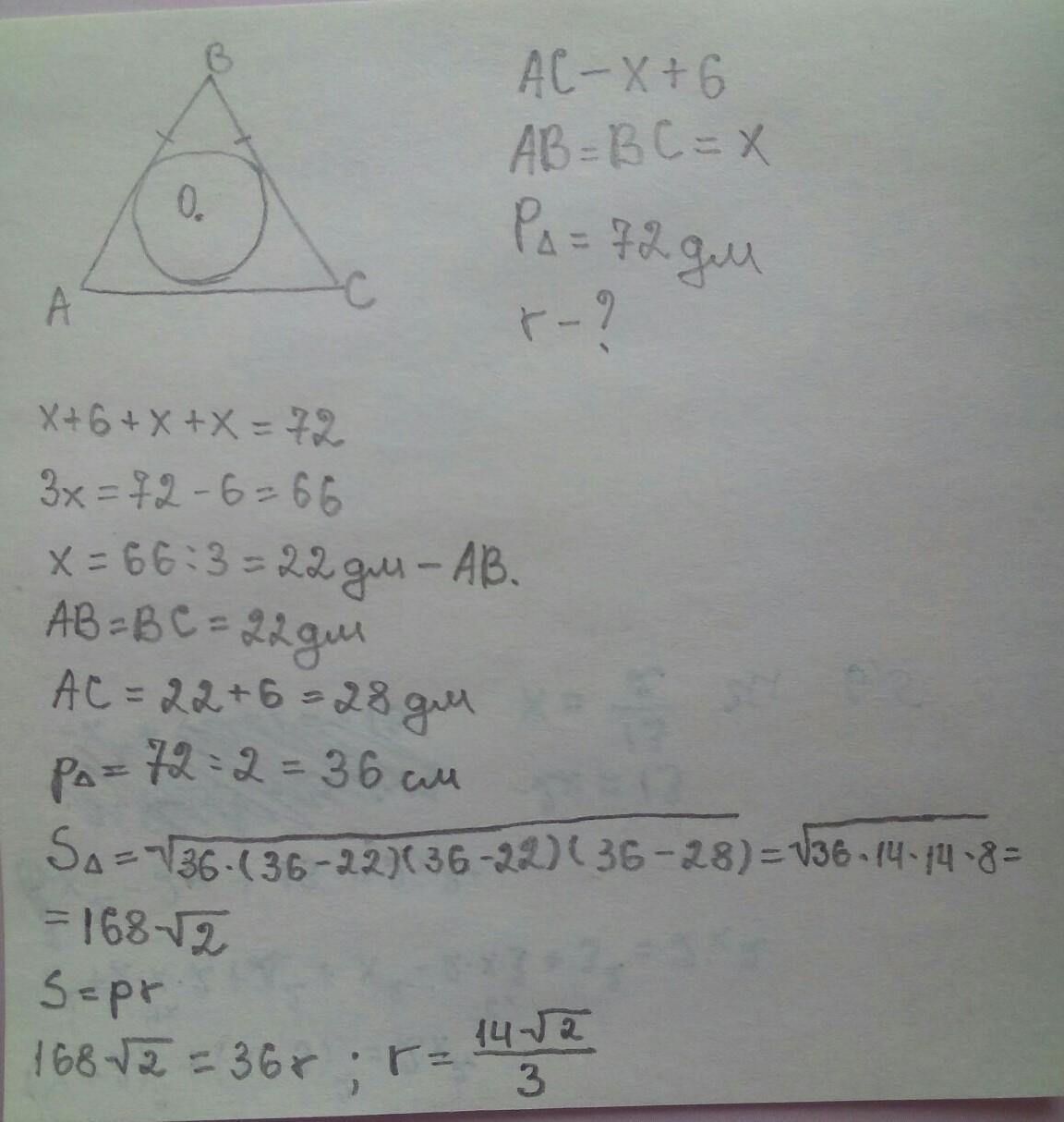 Основа рівнобедреного трикутника на 6 дм менша за бічну сторону. Знайдіть радіус вписаного кола, якщо периметр трикутника дорівнює 72 дм