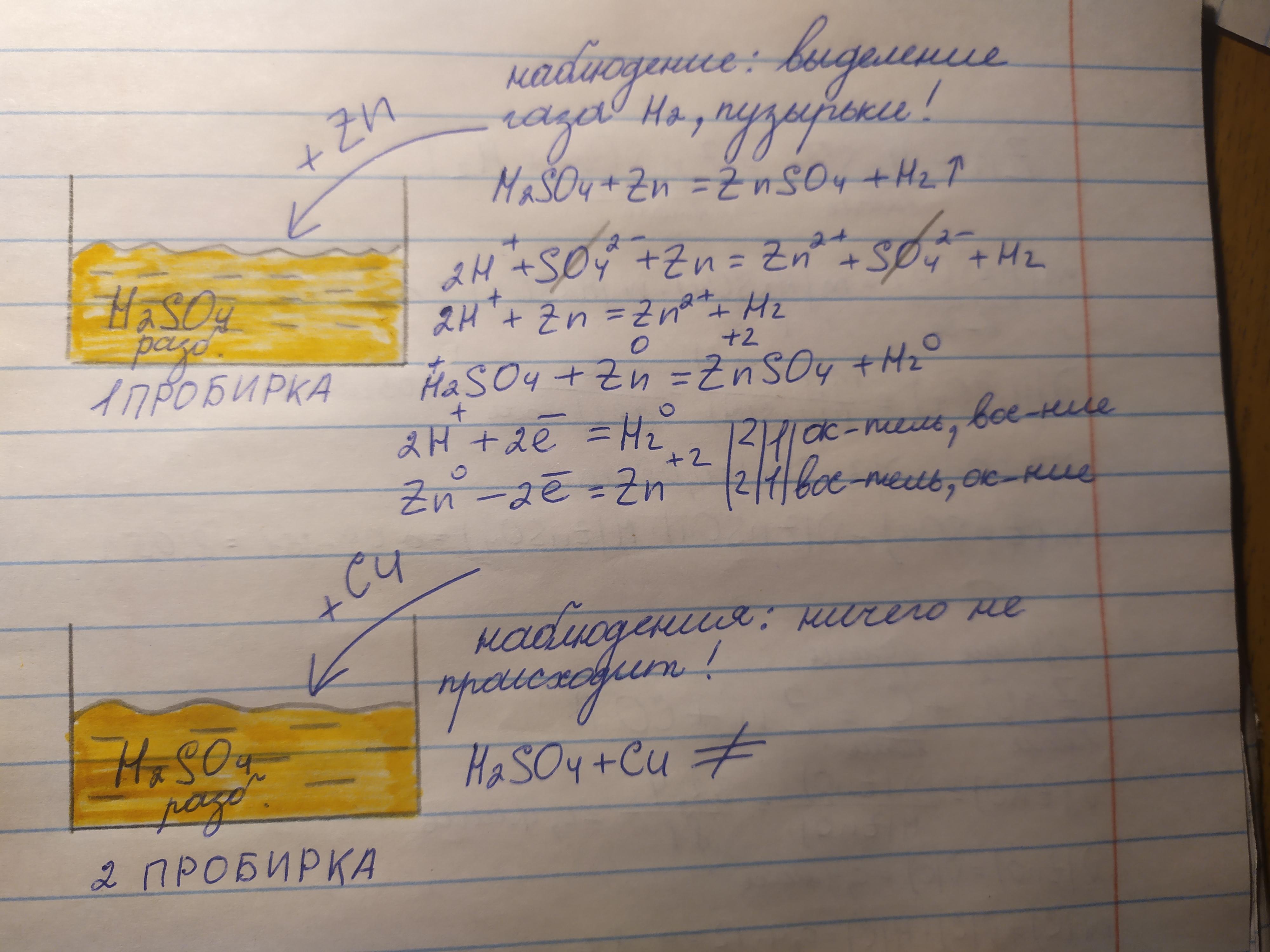 Во 2 пробирке ничего не происходит, такая как медь в ряду напряжений стоит после водорода, а, следственно, не может вытеснить водород из кислоты!