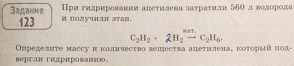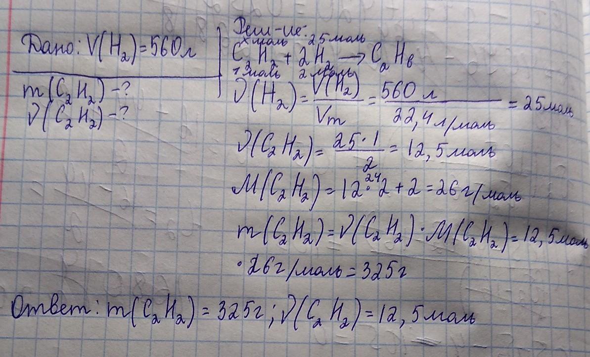 Сначала находим количество вещества(n)( т.к. мы знаем его объем и молярный объем ( которая всегда равна 22,4 г/моль)). А дальше подставляем найденное количество вещества вверх H2 в уравнении . Внизу ставим ставим коэффициенты перед веществами H2 и C2H2+ ,, моль" . Дальше делая пропорцию находим количество вещества C2H2 . И используя формулу n=m/M находим массу C2H2.
