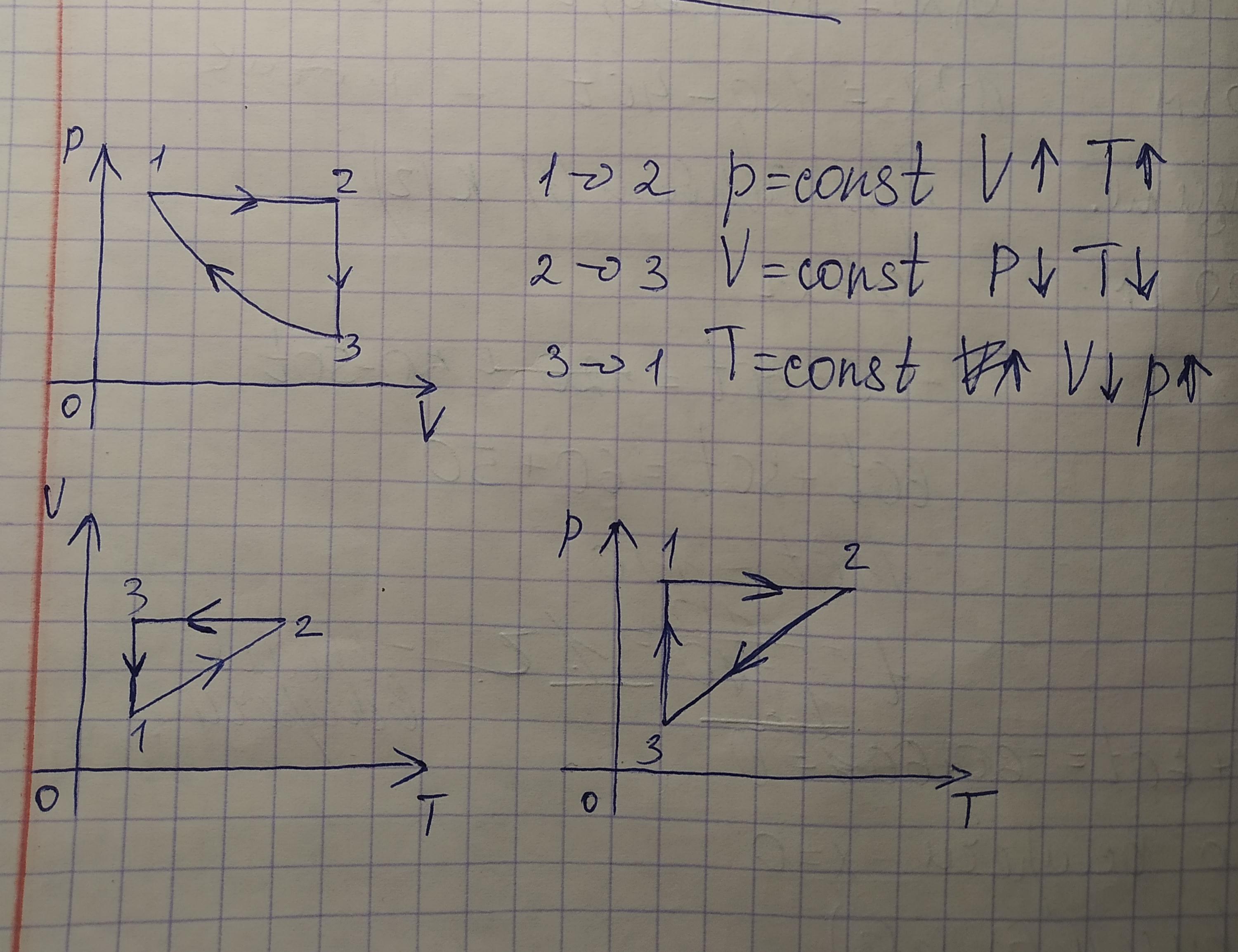 7. На рисунке изображены процессы изменения состояния некоторой массы газа. Назовите эти процессы. Изобразите графики процессов в системе координат V от Т и P от T.