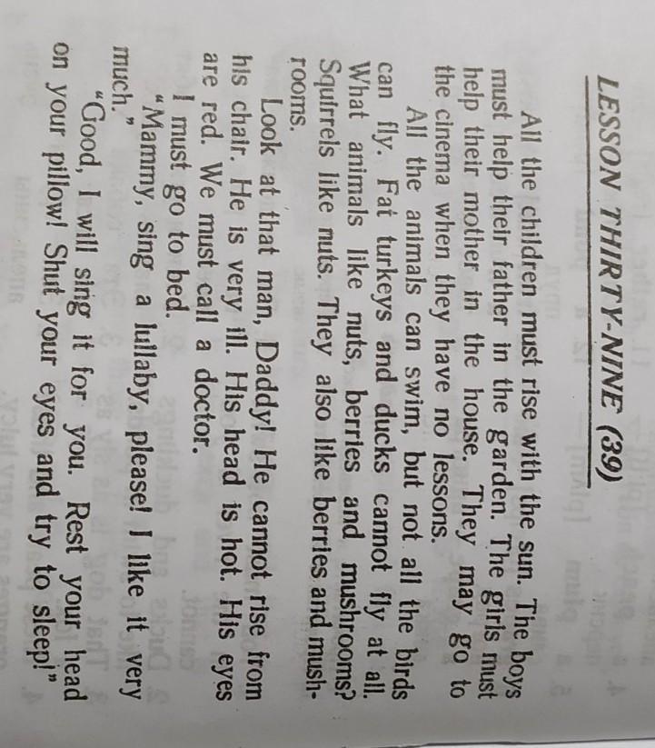 Эссон Тридцать девять (39) Все дети должны вставать с солнцем. Мальчики должны помочь отцу в саду. Девочки должны завести свою мать в доме. Они могут ходить в кино, когда у них нет уроков. Все животные умеют плавать, но не все птицы летают. Жирные индейки и утки не могут летать вообще. на животных как орехи, ягоды и грибы? сурки, как орехи. Они также любят ягоды и грибы. Посмотри на этого человека, папочка! Он не может встать со стула. Он очень болен. Его голова горячая. Его глаза красные. Мы должны вызвать врача. Я должен идти к кровати. * Мамочка, спой колыбельную, пожалуйста! Мне это очень нравится. "" Хорошо, я спою это для тебя. Положи голову нашей подушке! Закрой глаза и попробуй спать!