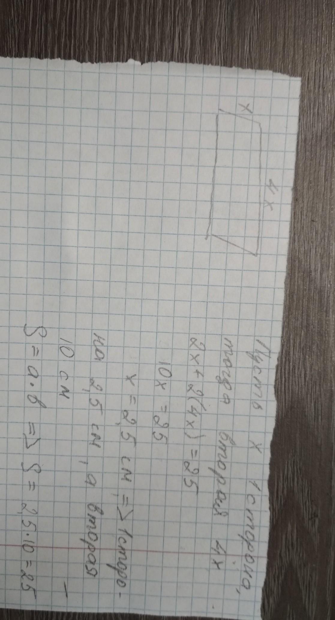 Периметр прямоугольника 25см , одна сторона в 4 раза длинее чем вторая. Вычисли площадь прямоугольника.