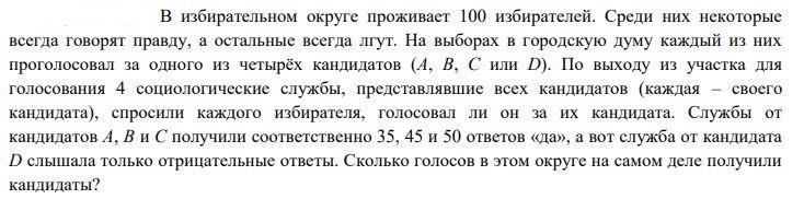 Далее заметим, что лжец в 3 случаях говорит, что голосовал за кандидата (каждого из A, B, C) и в 1 случае говорит, что не голосовал (за D). А значит каждый лжец увеличивает число положительных ответов на 2 по сравнению с тес, если бы он отвечал правдиво. Тогда число лжецов
