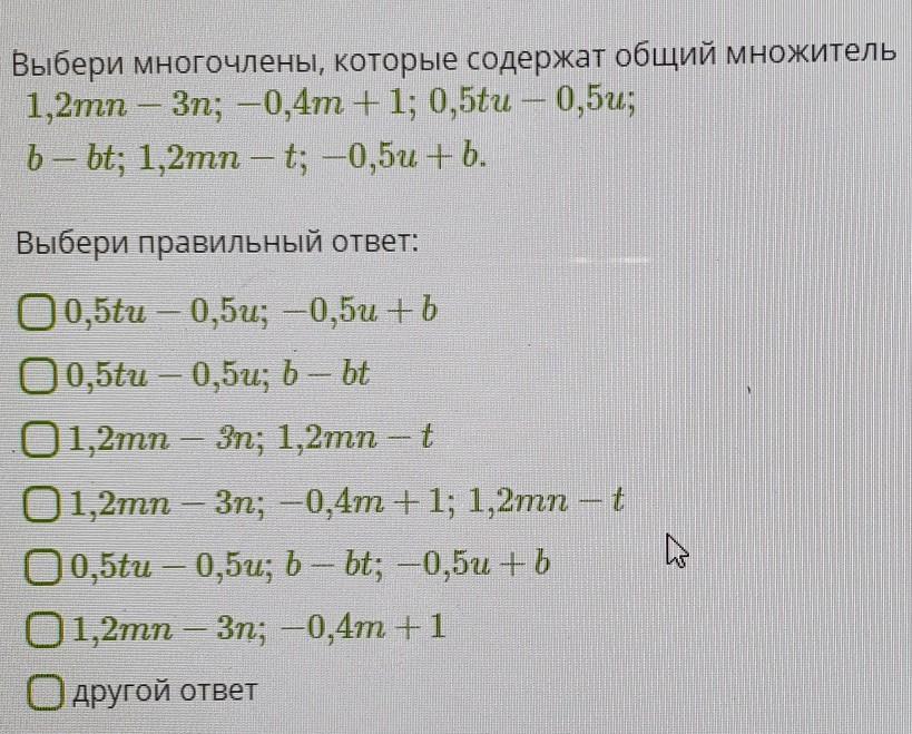 Выбери многочлены, которые содержат общий множитель 1,2mn - 3n; - 0,4m + 1; 0,5tu - 0,5u; b -bt; 1,2mn - t; -0,5u + b.