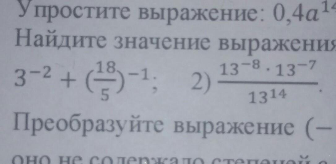 найдите значение выражения: 1) 3^-2 + (18/5)^-1; 2)13^-8 * 13^-7/13^14