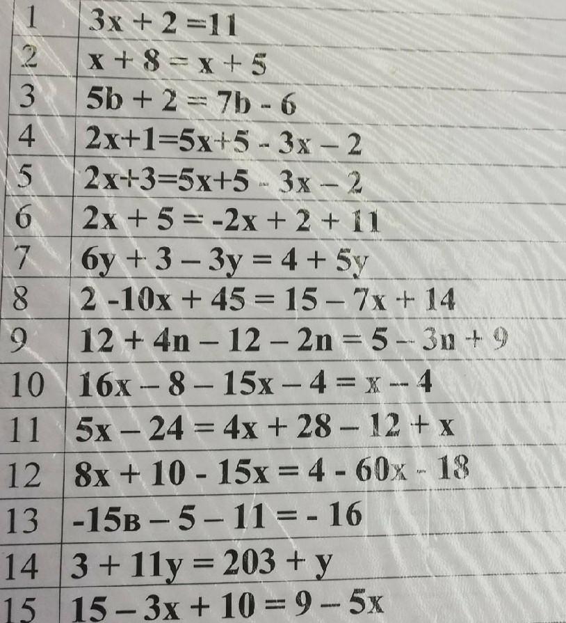 3)8-2b=0,b=4. 4)2x+1=2x+3. 5)нет решения.6)2х+5=11,2х-6=0,х=3. 7)3у+3=5у+4.