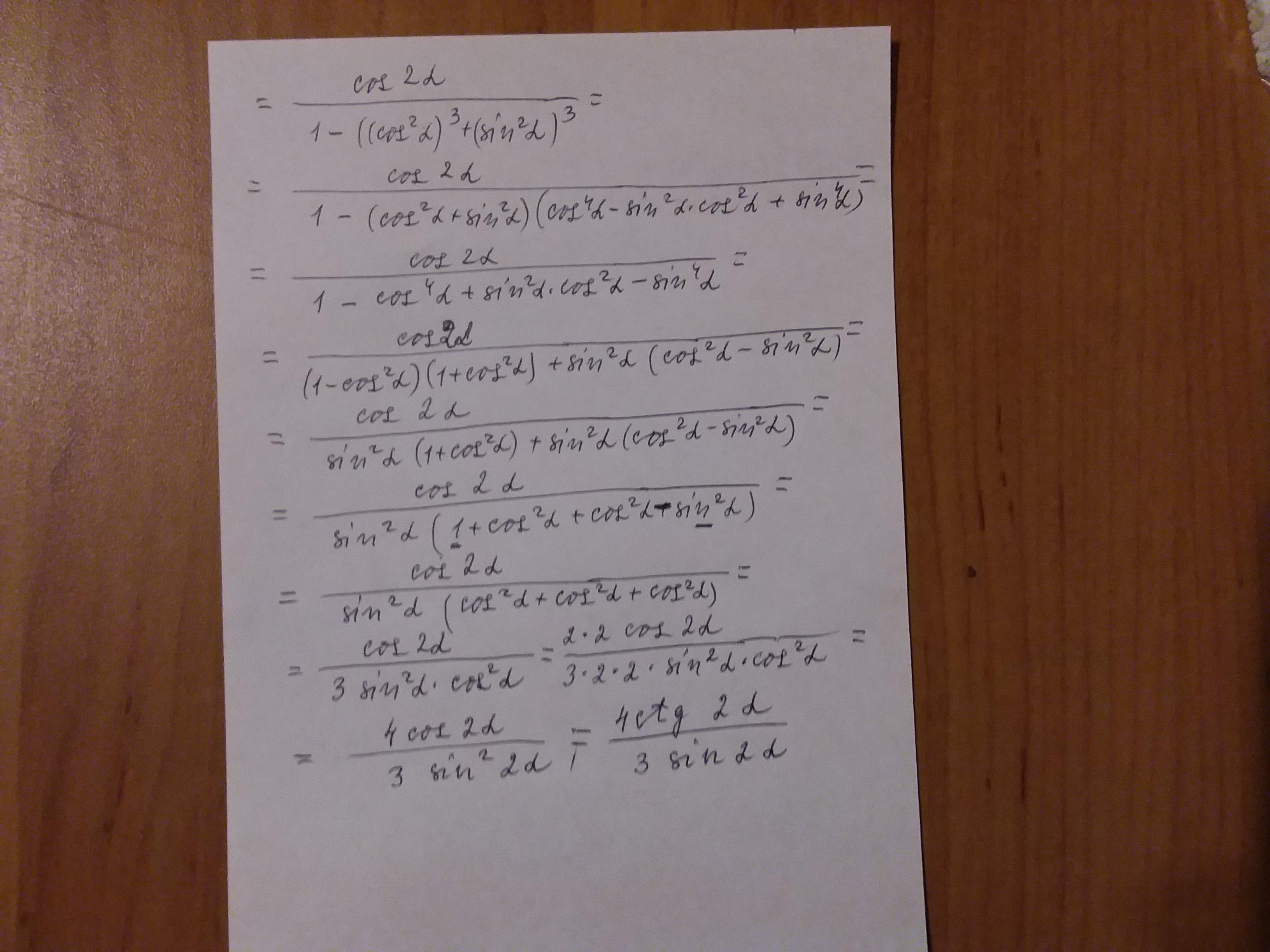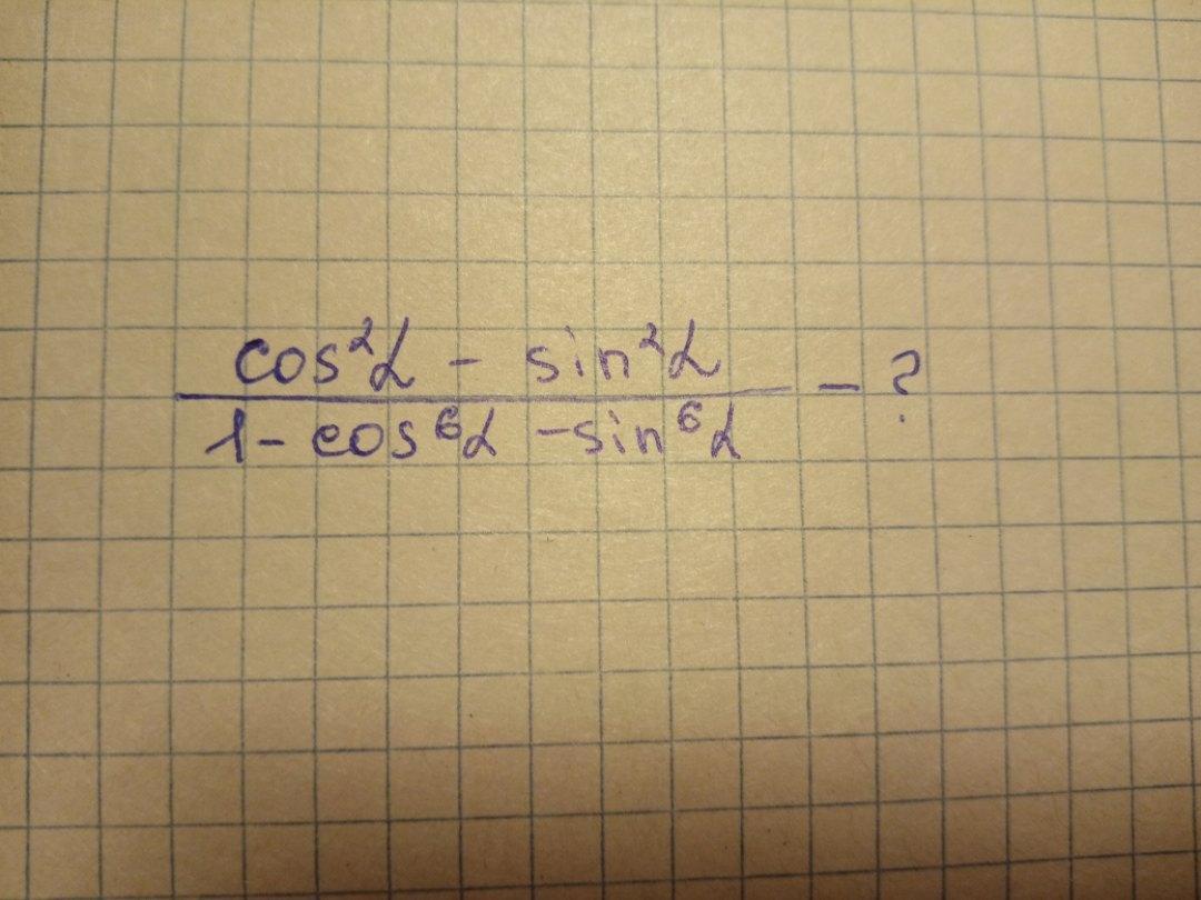 Объяснение:cos2α/ (1-((cos²α)³+(sin²α)³)= cos2α/(1-((cos²α+sin²α)(cos⁴α-cos²α·sin²α+sin⁴α))=