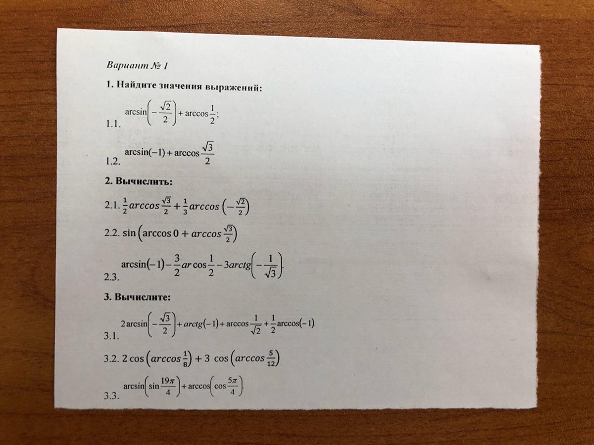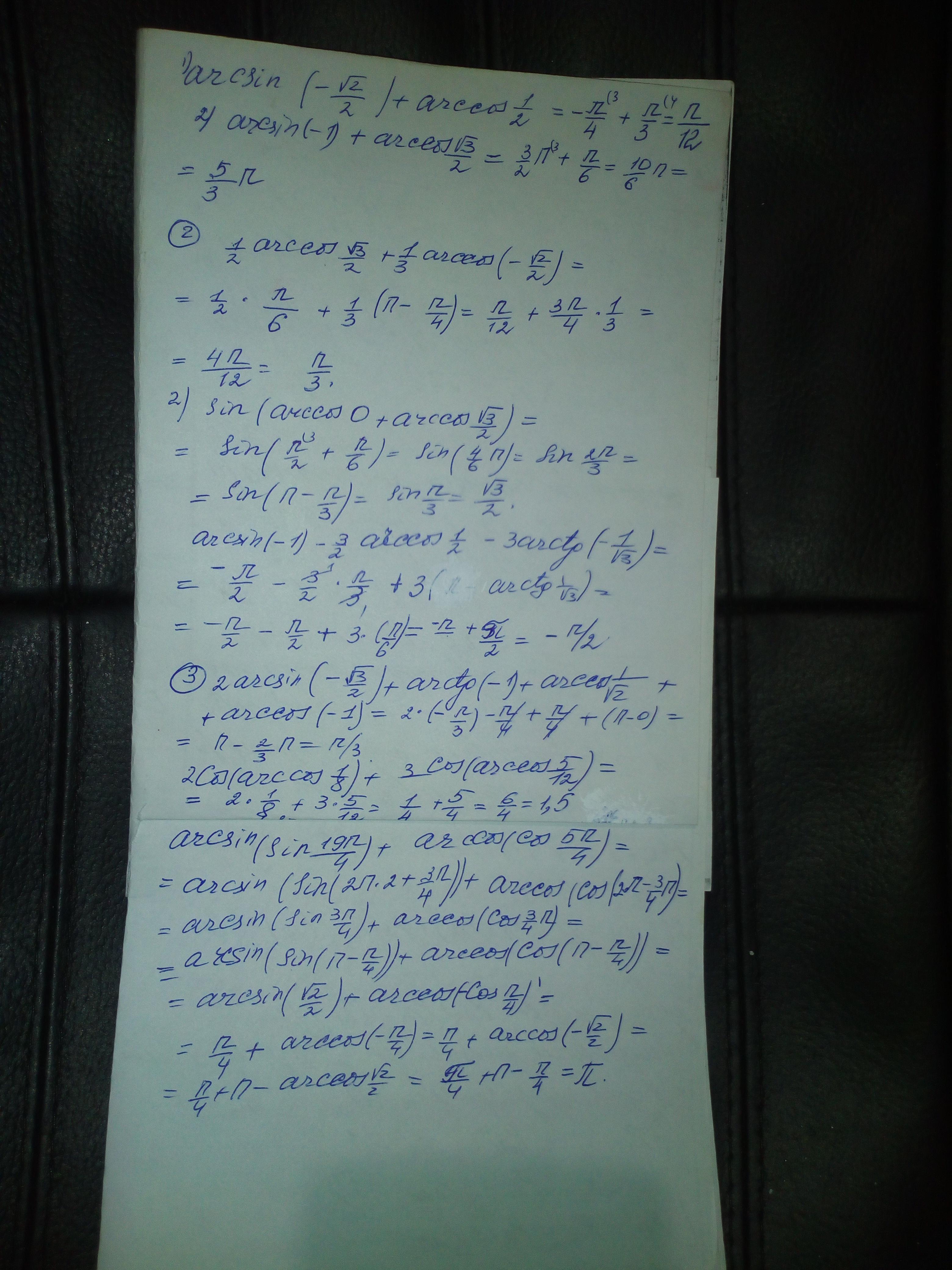 Вычислите: 1)arcsin (-1/2) + arccos 1/2 2)arcsin (-1) + arccos корень из 3 делённое на 2