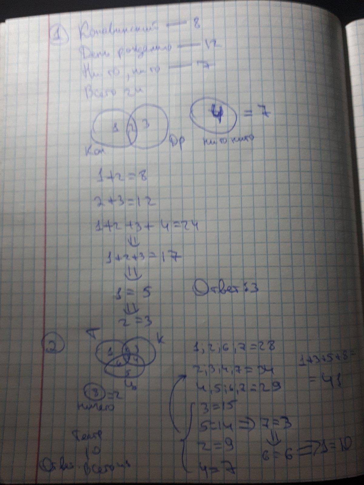 №1:в первом классе 8 человек живут в Канавинском районе, 12 человек празднуют день рождения весной. 7 человек не живут в этом районе и день рождения у них не весной. В классе 24 человека. Сколько в классе канавинцев, родившихся весной?