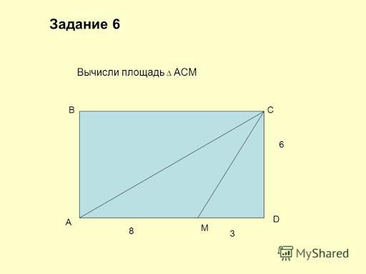 Решение было правильным. ам-основание; сd- высота. Площадь= половине произведения основания и высоты= 1/2(6*8)=1/2*(48)= 24(квадратных единицы). Олеся, в чем ошибка?