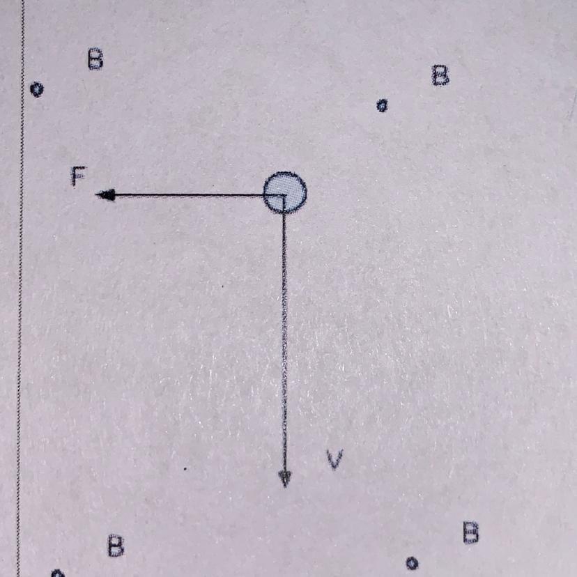 Магнитное поле действует с силой F на частицу, движущуюся со скоростью V, как на рисунке.