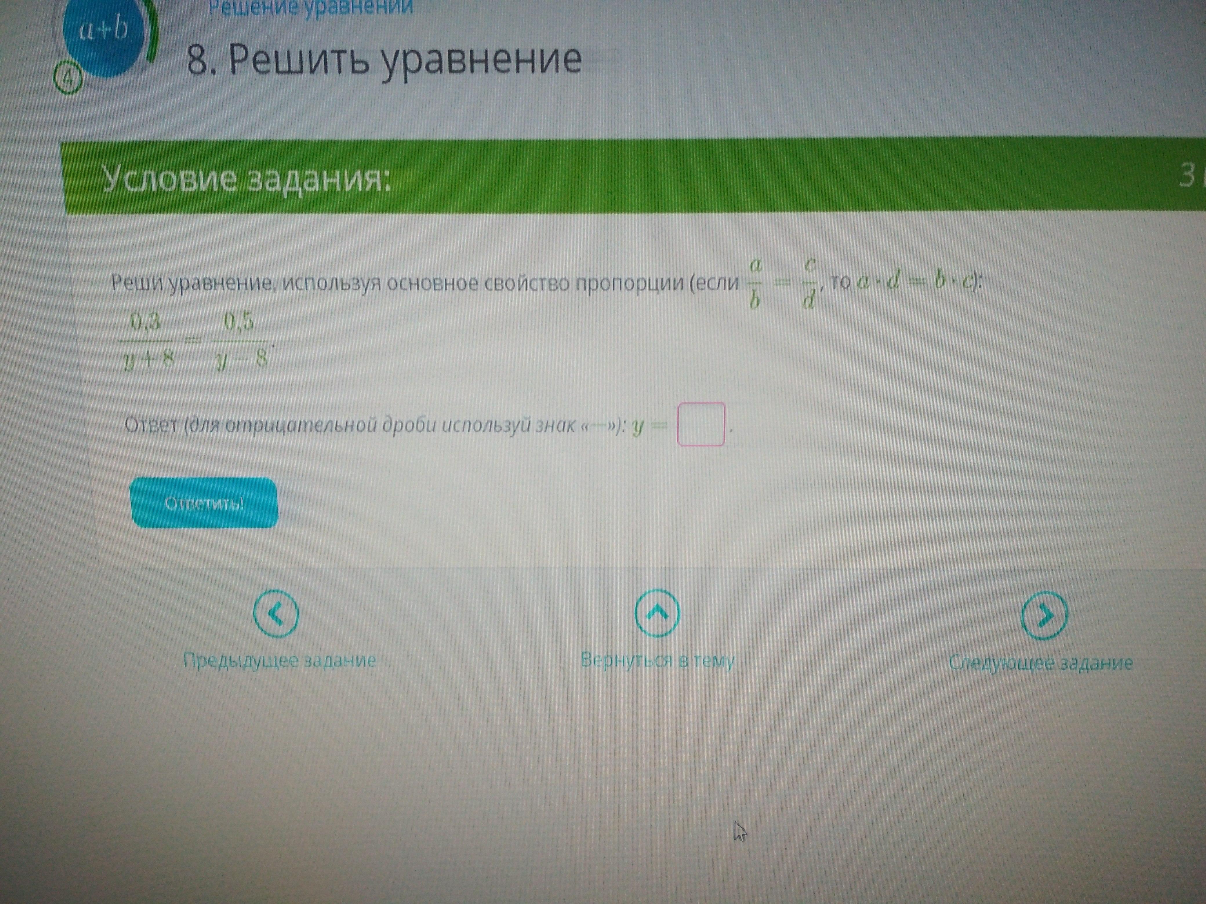 0.3(y  - 8) = 0.5(y + 8) \ 0.3y - 2.4 = 0.5y  + 4 \ 0.3y - 0.5y = 4 + 2.4 \  - 0.2y = 6.4 \ y =  - 32