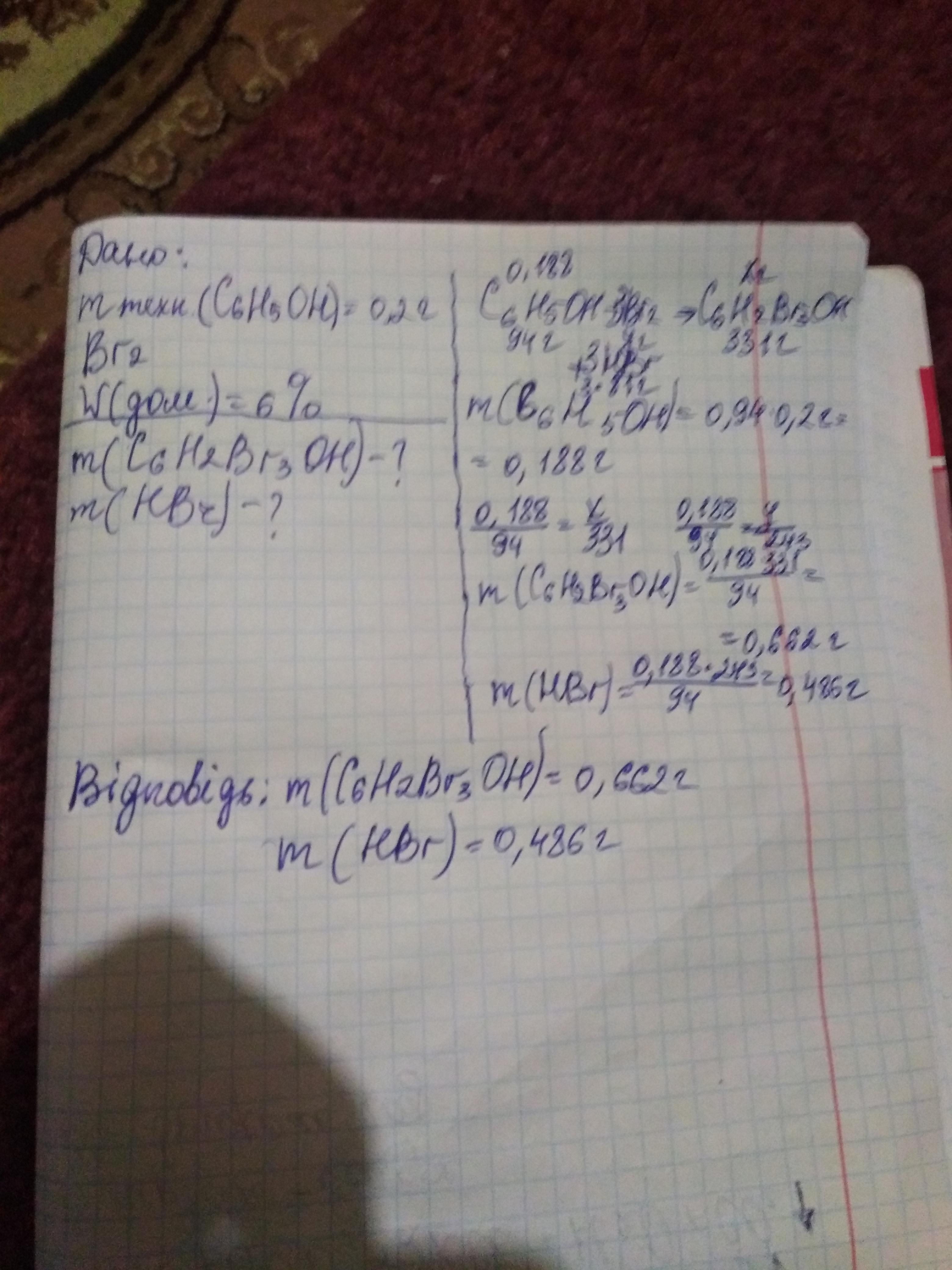 Обчисліть масу продукту реакції,що утвориться під час взаємодії технічного фенолу масою 0,2 г з масовою часткою домішок 6% з бромною водою