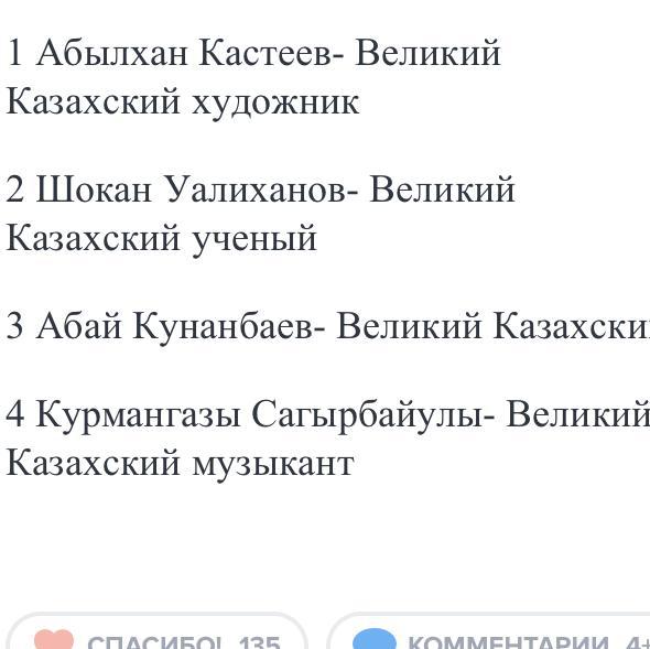 1 Казахский великий художник 2 Великий учёный 3 знаменитый поэт ,мыслитель 4) Великий музыкант