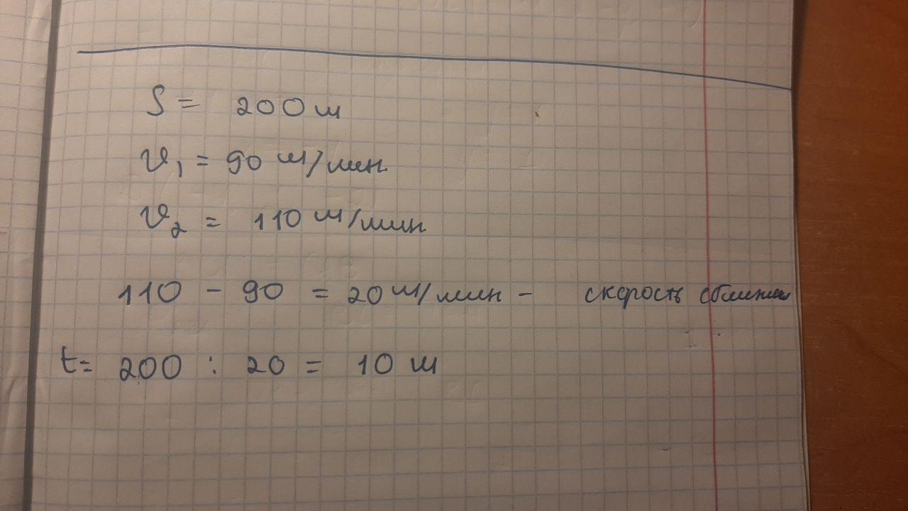 Расстояние между домами Алии и Марины 200 м. Они вышли в кинотеатр одновременно в одном направлении. Марина шла со скоростью 90м/мин, а Алия шла вдогонку со скоростью 110м/мин. Через сколько минут Алия догонит Марину?