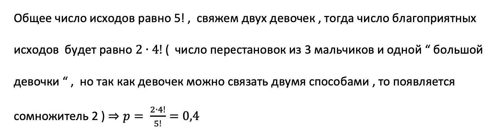 Пусть первая девочка сидит левее второй. Тогда если они сидят вместе, то на местах соответственно: 1 и 2, 2 и 3, 3 и 4, 4 и 5 - 4 варианта. Для каждого варианта есть 3! = 6 вариантов рассадки мальчиков (девочки зафиксированы на своих местах). Тогда суммарно в этом случае будет 4*6 = 24 подходящих случая. Если они поменяются местами - это ещё 24 варианта, итого 48 нужных вариантов из 120, т.е. вероятность равна = 0,4.