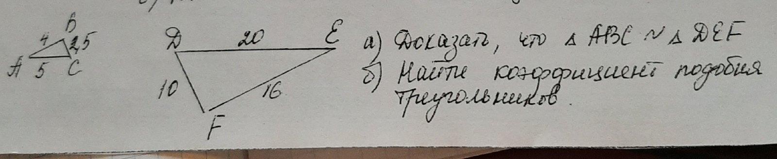 А) так как 10/2.5=20/5=16/4 значит стороны пропорциональны значит треугольник подобны коэфицент равен 4